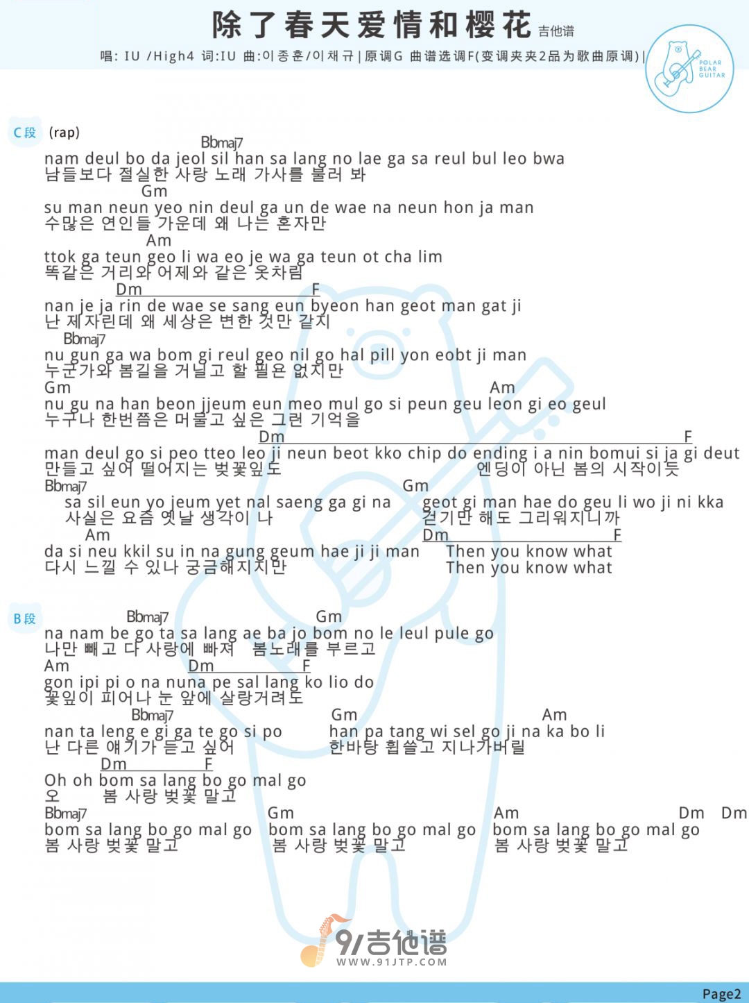 曲谱介绍: 曲谱简介:除了春天爱情和樱花吉他谱,IU演唱的一首歌曲,4/4拍的节奏,这首歌曲的原调为G调,这里曲谱采用了F调指法进行编配,演唱时夹变调夹2品可回到原调,也可根据个人实际嗓音情况选择。曲谱由白熊音乐编配出品。这首歌以甜美的原声吉他伴奏开始,是纯乐器随着流畅的旋律打造出的带有爵士欢快感的歌曲。IU亲自填写的歌词与优美的旋律一起完美地传达了春天的清新的感觉。