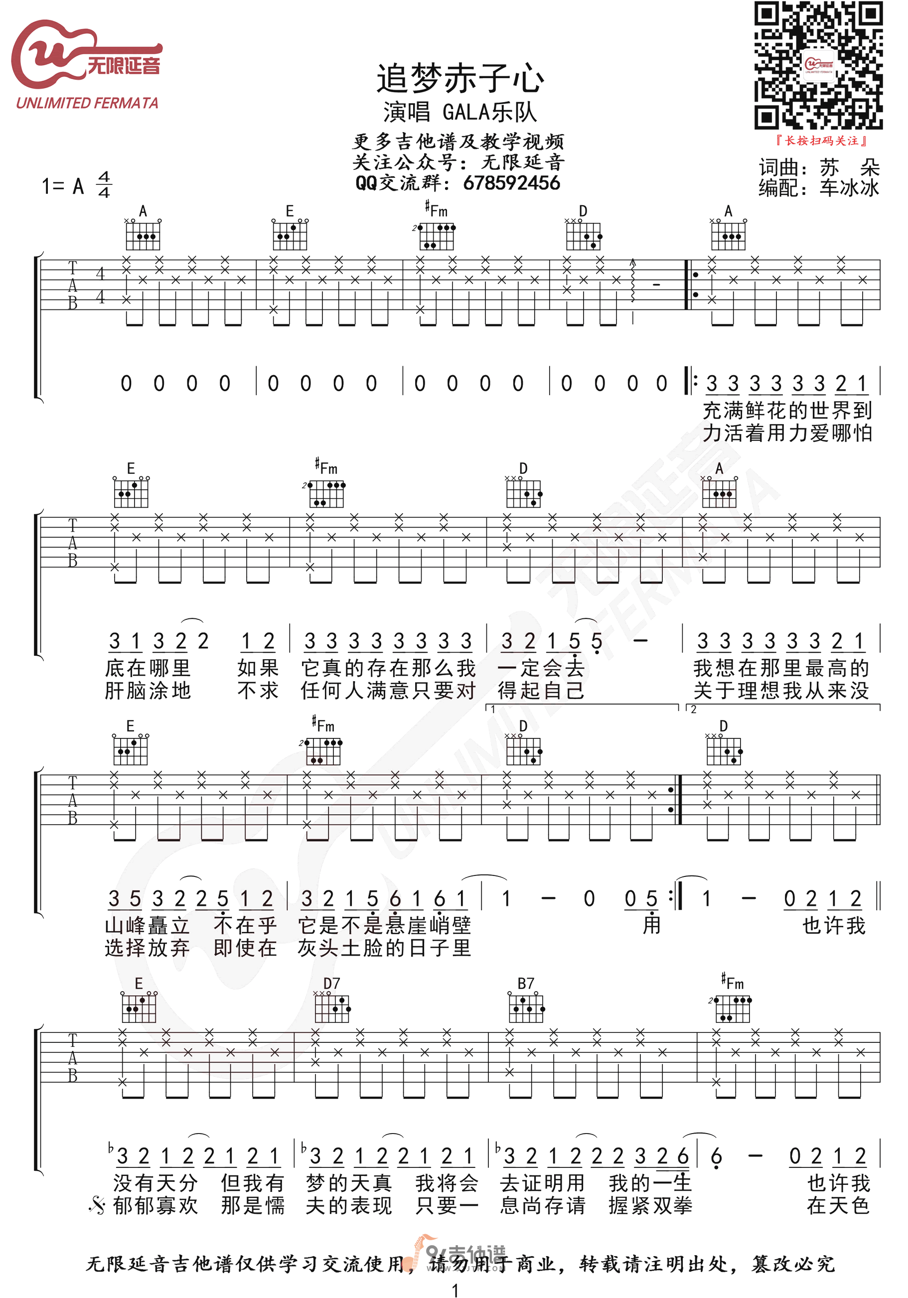曲谱介绍: 曲谱简介:追梦赤子心吉他谱,GALA乐队演唱的一首歌曲,4/4拍的节奏,这首歌曲的原调为A调,这里曲谱采用了A调指法进行编配,演唱时可不夹变调夹,曲谱由无限延音编配出品。这首歌是由GALA乐队演唱的一首经典励志歌曲,GALA乐队希望用这首歌来告诉大家:就算遇到挫折、受到嘲笑,也要勇敢的向前跑,永不停止。
