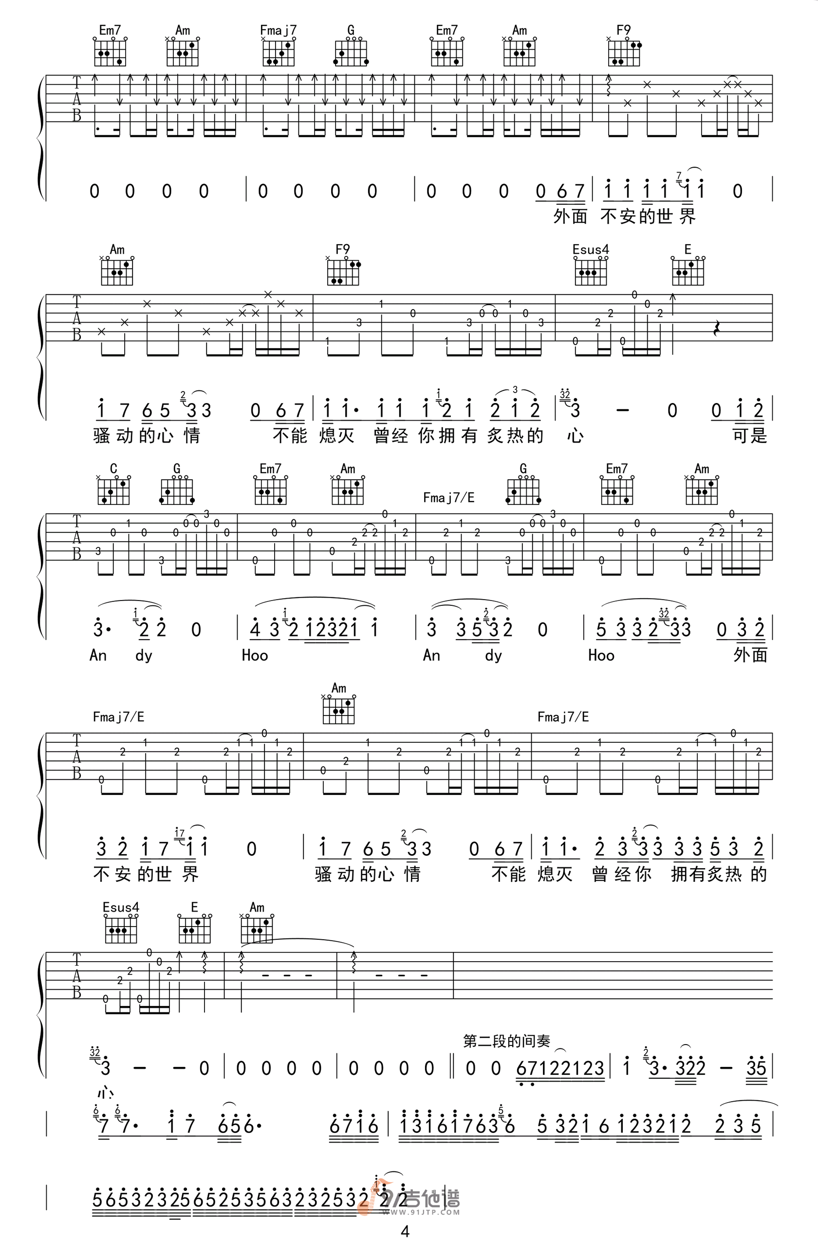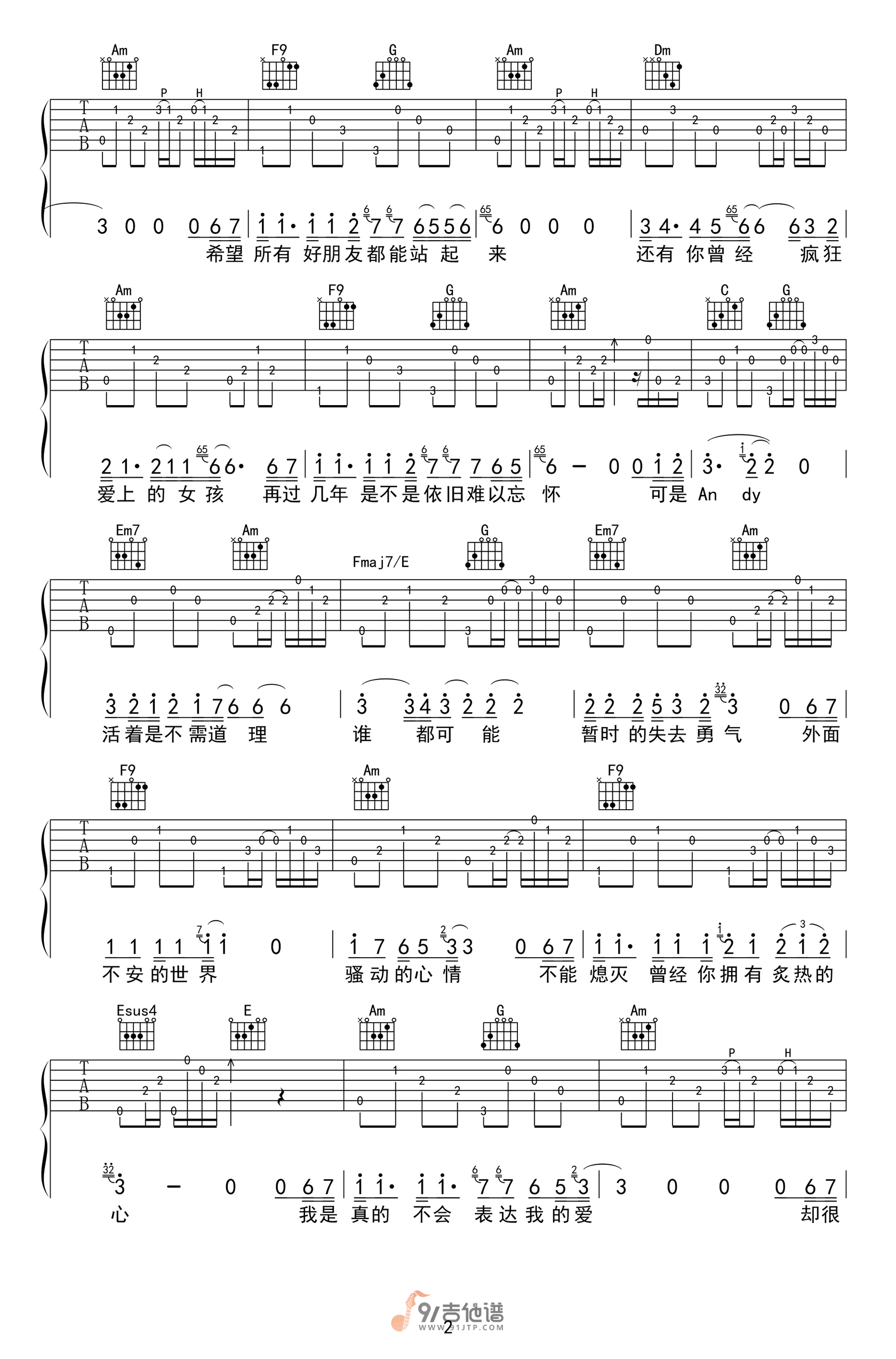 曲谱介绍: 曲谱简介:Andy吉他谱,阿杜演唱的一首歌曲,4/4拍的节奏,这首歌曲的原调为C调,这里曲谱采用了C调指法进行编配,演唱时可不夹变调夹,曲谱由琴谱网更新上传,共4张高清图片弹唱吉他谱例,曲谱来源于网络转载,编配制谱者暂不详。这首歌受到成熟男子们的喜欢,唱出了属于熟男的不安。虽然熟男已经历了许多的大风大浪,但是在他们的内心深处却还是会有着不安的感觉,只是没有人了解,但ANDY懂。