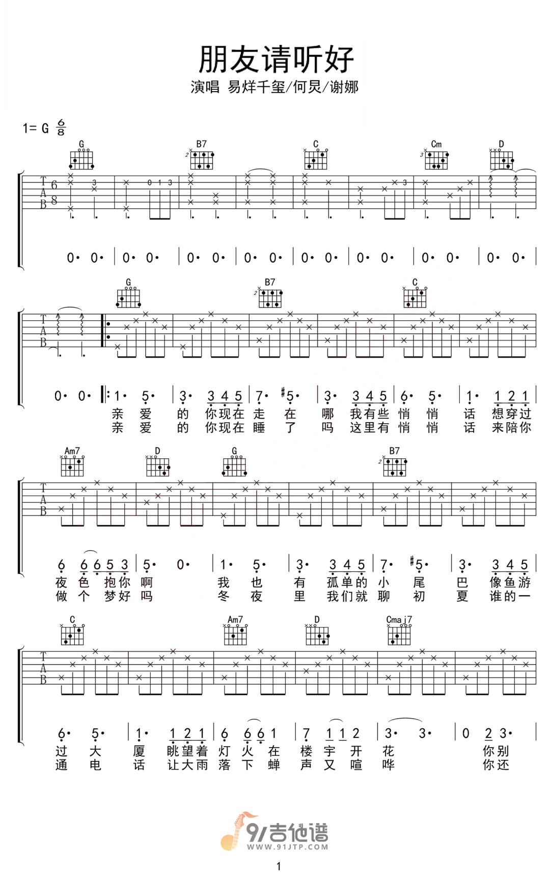 曲谱介绍: 曲谱简介:朋友请听好吉他谱,易烊千玺演唱的一首歌曲,6/8拍的节奏,这首歌曲的原调为G调,这里曲谱采用了G调指法进行编配,演唱时可不夹变调夹,曲谱由琴谱网更新上传,共3张高清图片弹唱吉他谱例,曲谱来源于网络转载,编配制谱者暂不详。这首歌是综艺节目《朋友请听好》的同名主题曲,旋律比较动听,非常不错的一首歌曲。