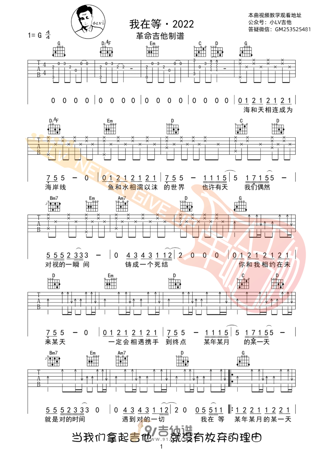 曲谱介绍: 曲谱简介:我在等吉他谱,苏星婕演唱的一首歌曲,4/4拍的节奏,这首歌曲的原调为G调,这里曲谱采用了G调指法进行编配,演唱时可不夹变调夹,曲谱由革命吉他编配出品。