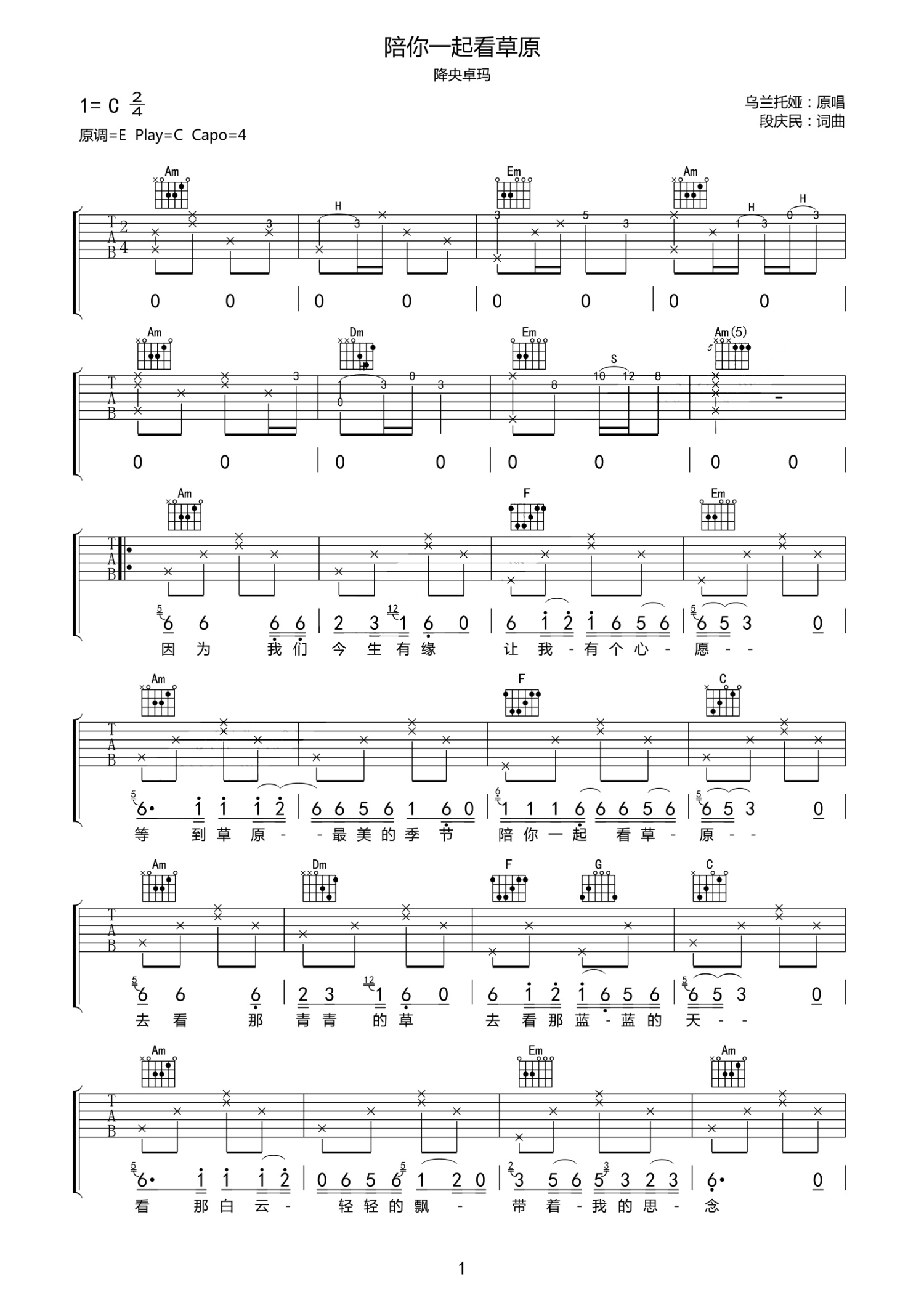 曲谱介绍: 降央卓玛《陪你一起看草原》吉他谱_C调吉他弹唱谱