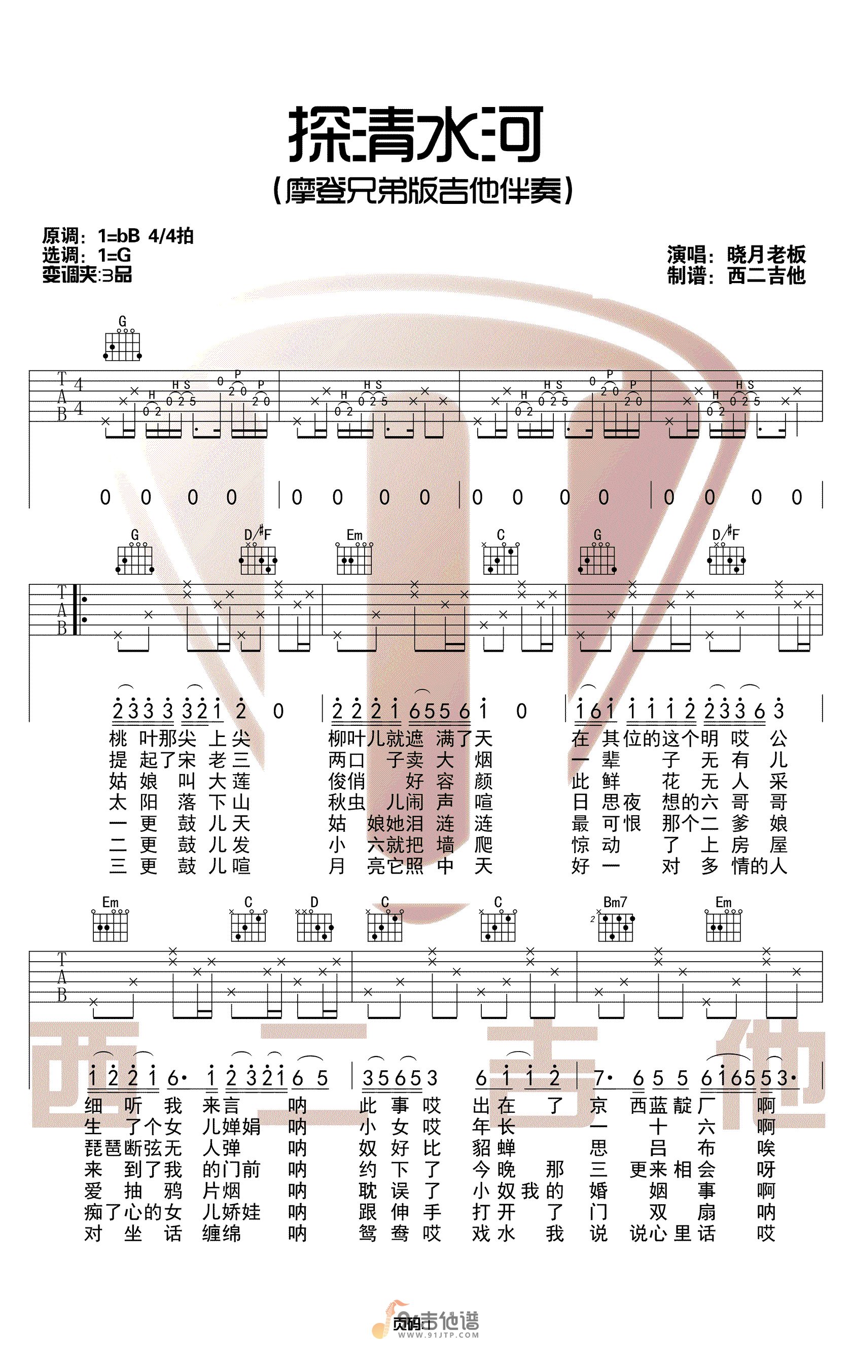 曲谱介绍: 曲谱简介:探清水河吉他谱,晓月老板演唱的一首歌曲,4/4拍的节奏,这首歌曲的原调为降B调,这里曲谱采用了G调指法进行编配,演唱时夹变调夹3品可回到原调,也可根据个人实际嗓音情况选择。曲谱由山山吉他编配出品。这首歌最初老源于老北京的一首民间小曲儿,后晓月老板翻唱走红,这里的谱子为摩登兄弟版吉他伴奏。