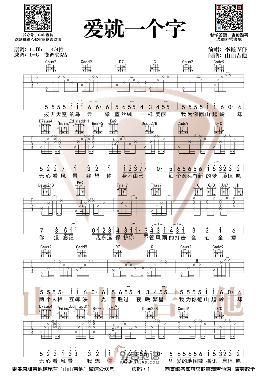 曲谱介绍: 曲谱简介:爱就一个字吉他谱,李巍V仔演唱的一首歌曲,4/4拍的节奏,这首歌曲的原调为降B调,这里曲谱采用了G调指法进行编配,演唱时夹变调夹3品可回到原调,也可根据个人实际嗓音情况选择。曲谱由山山吉他编配出品。这首歌唱出了爱的本质,它表达了亲情血浓于水,同样更适合用来表达爱情:爱就一个字,我只说一次哦。