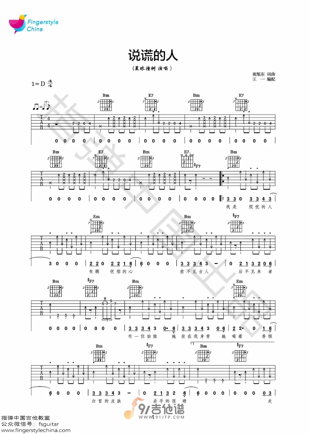 曲谱介绍: 曲谱简介:说谎的人吉他谱,星球撞树演唱的一首歌曲,4/4拍的节奏,这首歌曲的原调为D调,这里曲谱采用了D调指法进行编配,演唱时可不夹变调夹,曲谱由王一编配出品。
