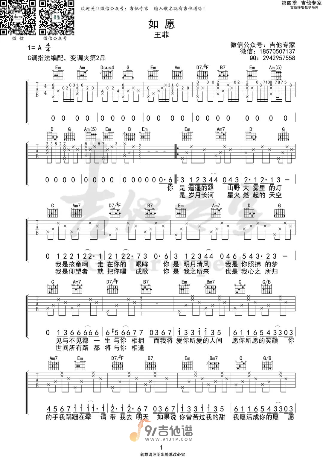 如愿吉他谱 - 王菲 - G调吉他弹唱谱 - 原版