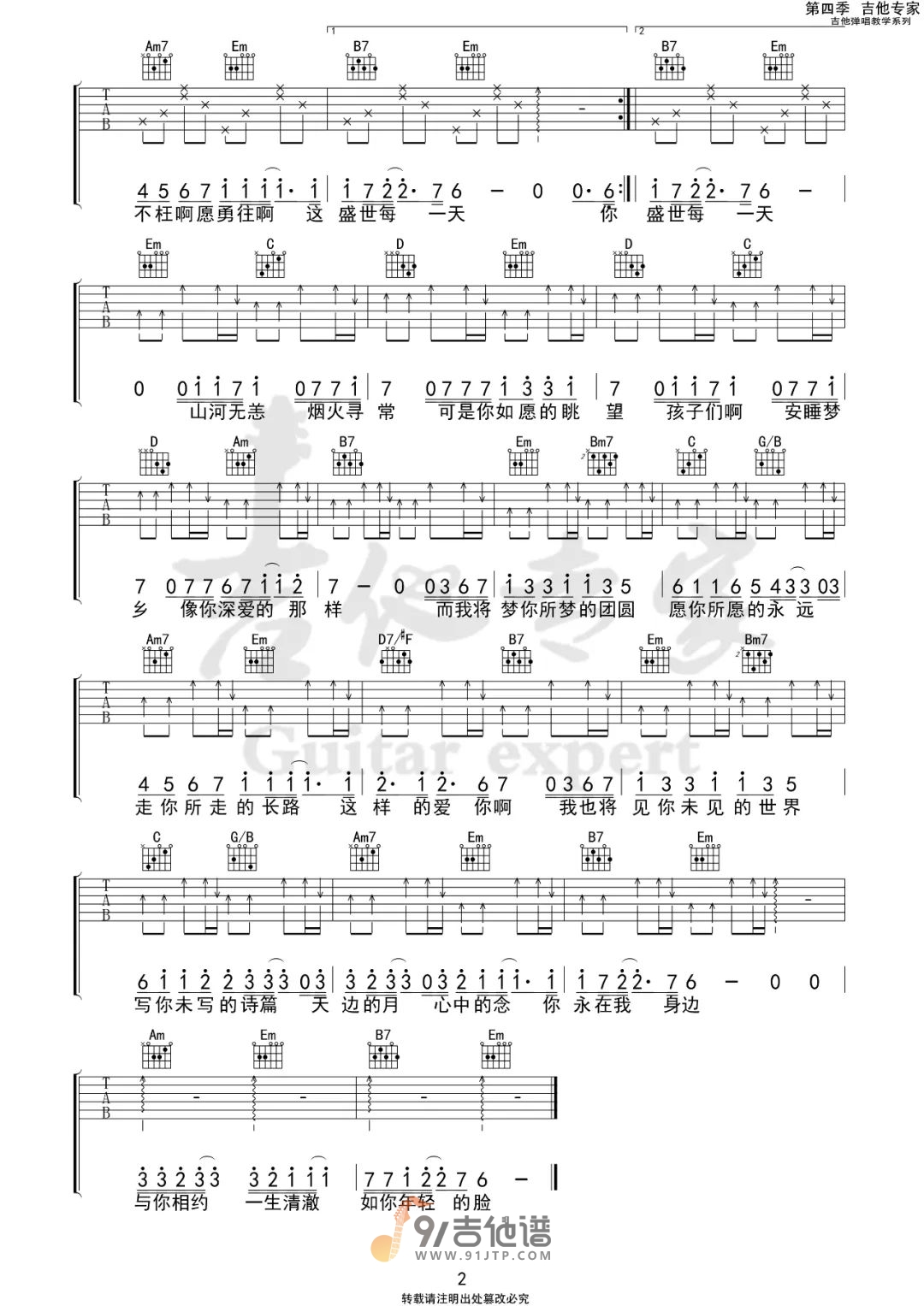 曲谱介绍: 曲谱简介:如愿吉他谱,王菲演唱的一首歌曲,4/4拍的节奏,这首歌曲的原调为A调,这里曲谱采用了G调指法进行编配,演唱时夹变调夹2品可回到原调,也可根据个人实际嗓音情况选择。曲谱由吉他专家编配出品。这首歌是电影《我和我的父辈》的主题推广曲,在这首歌中,王菲以其空灵的唱腔动情讲述着两代人之间的传承之情。