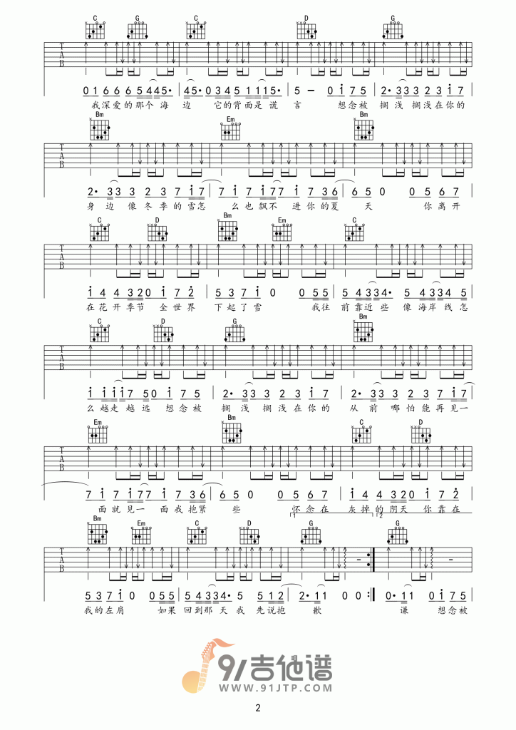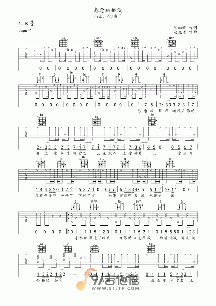 曲谱介绍: 曲谱简介:想念被搁浅吉他谱,山止川行演唱的一首歌曲,4/4拍的节奏,这首歌曲的原调为B调,这里曲谱采用了G调指法进行编配,演唱时夹变调夹4品可回到原调,也可根据个人实际嗓音情况选择。曲谱由琴谱网更新上传,共2张高清图片弹唱吉他谱例,曲谱来源于网络转载,编配制谱者暂不详。