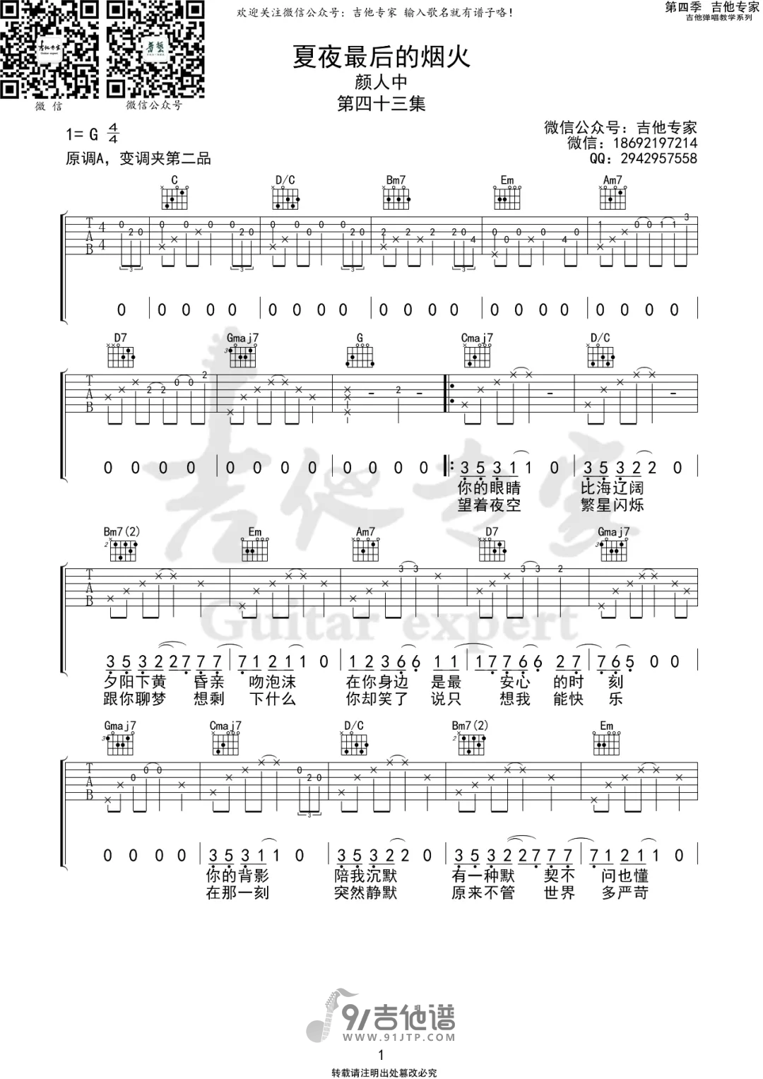 曲谱介绍: 曲谱简介:《夏夜最后的烟火》吉他谱 颜人中弹唱六线谱,《夏夜最后的烟火》是由颜人中演唱的一首歌。
