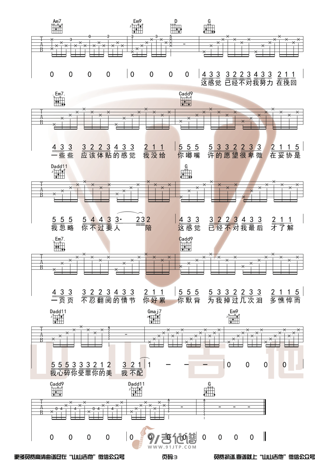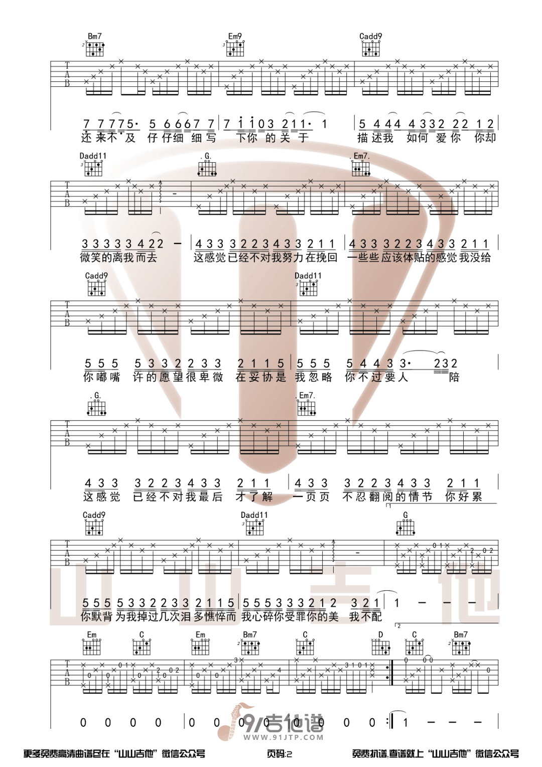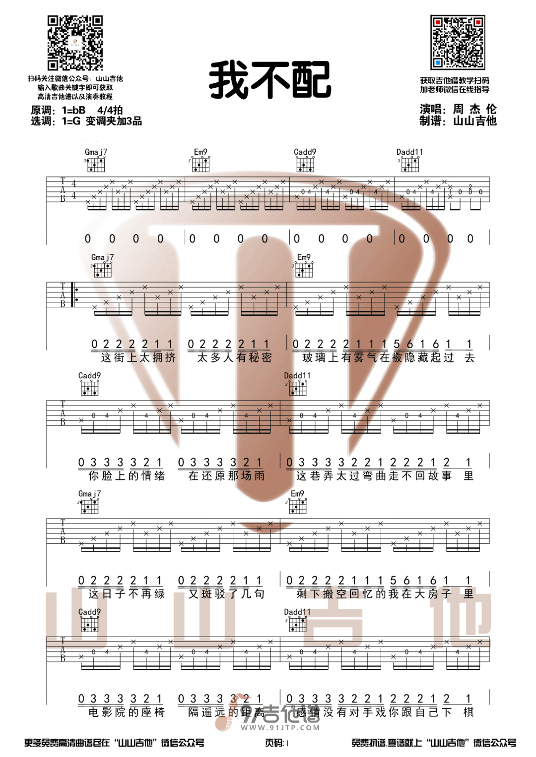 曲谱介绍: 曲谱简介:《我不配》吉他谱 周杰伦原版吉他弹唱六线谱,《我不配》是由方文山作词、周杰伦作曲并演唱的一首情歌,这首歌无论是歌词还是歌曲的MV都是那么无奈,周杰伦与侯佩岑的恋情也是如此吧,充满无奈:被狗仔四处偷拍,毫无隐私可言,也可能是因为此“周候恋”也结束了···配与不配,事业与爱情,该如何选择?