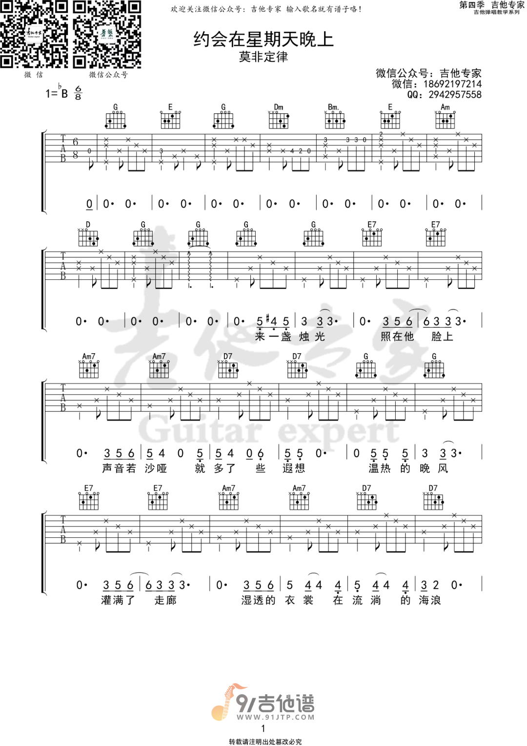 曲谱介绍: 曲谱简介:《约会在星期天晚上》吉他谱 莫非定律原版弹唱六线谱,《约会在星期天晚上》是由莫非定律MoreFeel作词作曲并演唱的一首歌,歌曲通过留声机复古的声响拉开了序幕,钢琴美妙的乐声配合着充满vintage味道的pop jazz曲风,让人一下穿越回了60年代,在夜晚的街市,舞台边上的爵士乐手刚弹奏完最后一个音符,舞动嬉笑的人群仍然喧闹嘈杂,在暖色调灯光下,心里等待的那个人正要入座,什么也不去想,什么也不去做,彼此相望相视。