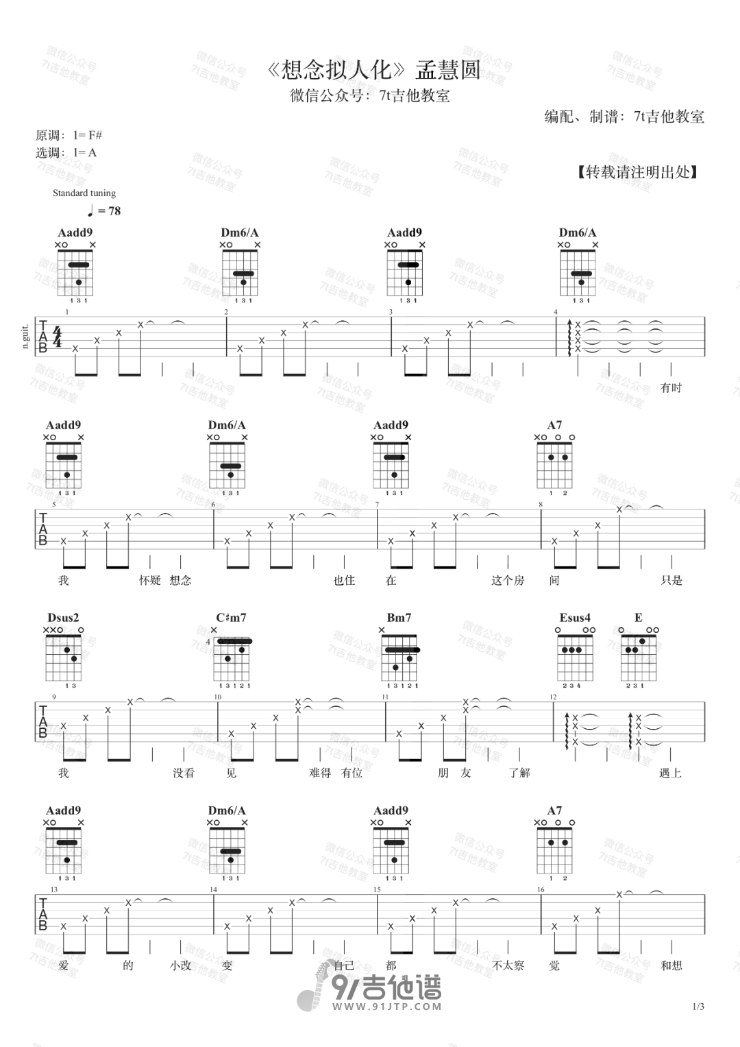 曲谱介绍: 曲谱简介:《想念拟人化》吉他谱 孟慧圆原版吉他弹唱六线谱,《想念拟人化》是由孟慧圆演唱的一首歌曲,你留给我的想念,在心里面,整理一遍一遍又一遍。拥有过再失去的记忆总是很扎心,所谓想念,就是在某个不经意的时间回想起了那个虽然已经消失,但是自己不想让它消失的东西。歌曲原调为#F调,这里采用了A调指法进行编配。