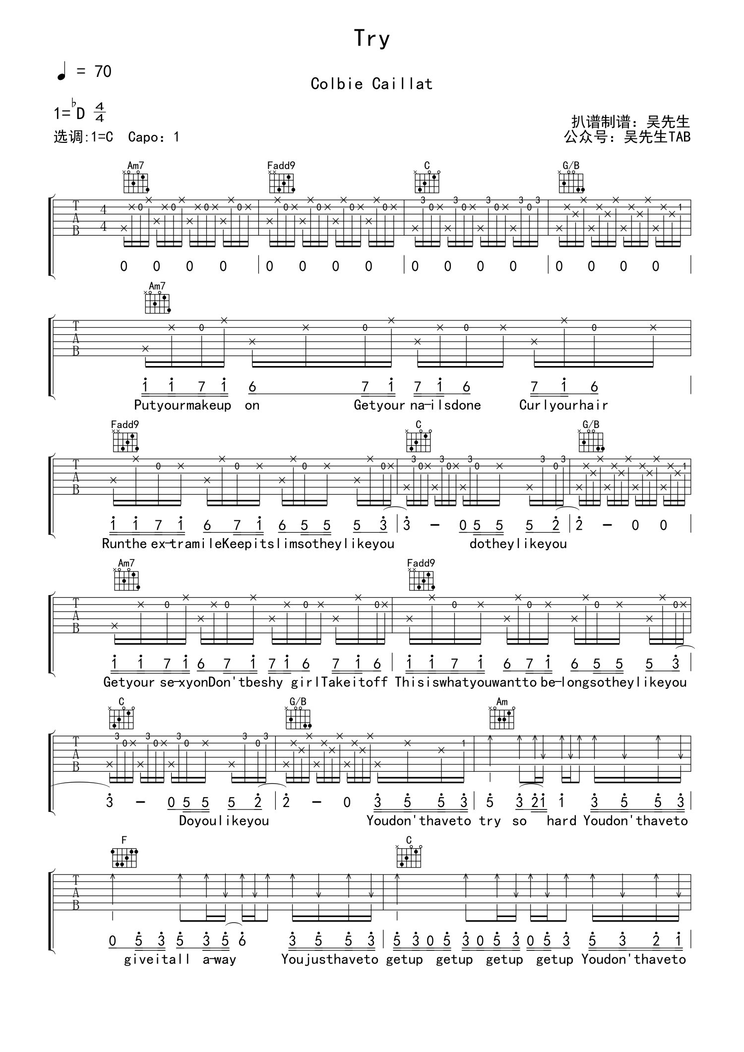 曲谱介绍: Try吉他谱,美国流行女歌手ColbieCaillat的一首英文歌曲,Try六线谱,原调bD,选用C调指法,CAPO夹一品,完整版共4张高清图片谱。吴先生编配制谱
