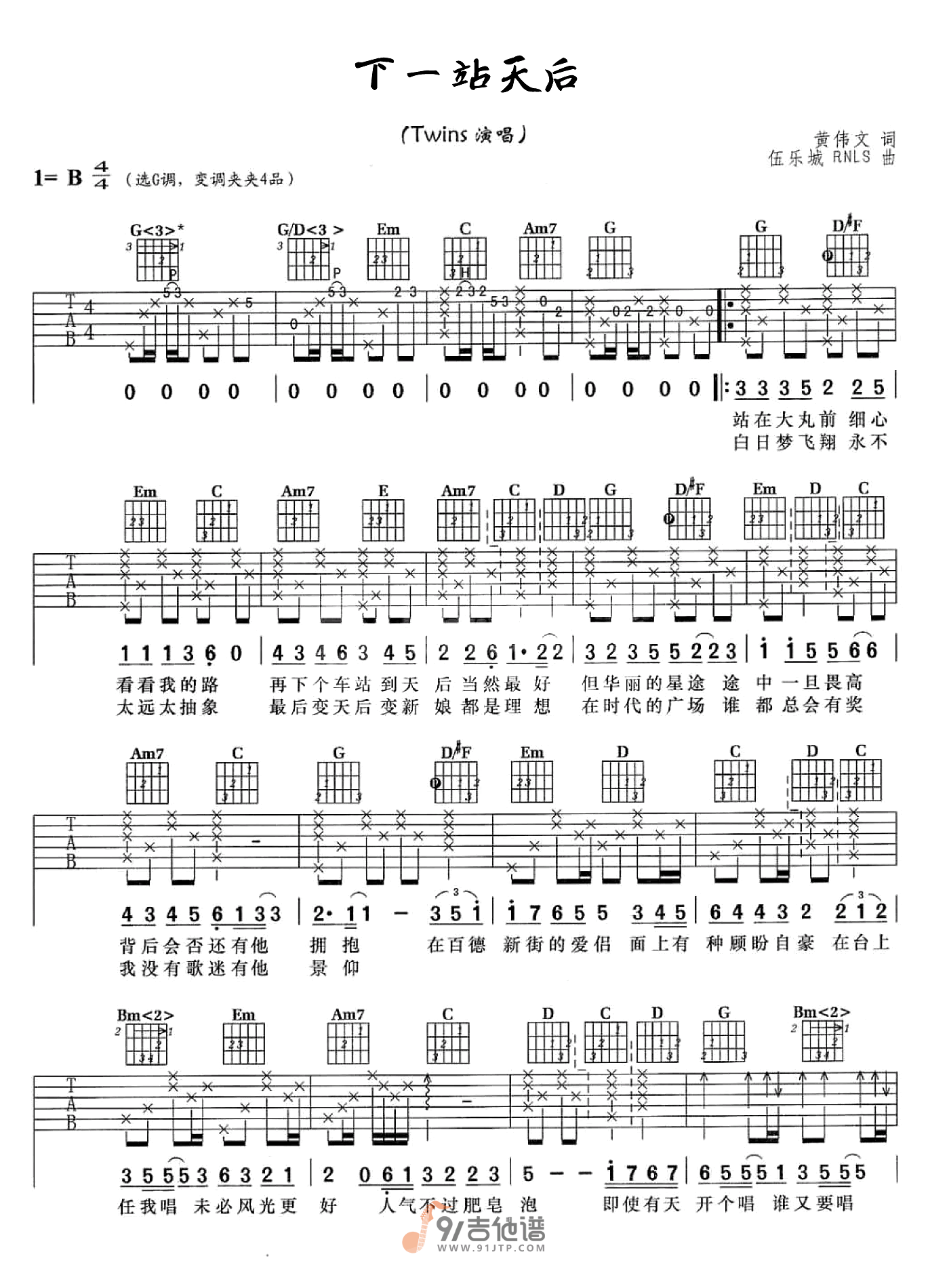 下一站天后吉他谱 - Twins - G调吉他弹唱谱 - 原版
