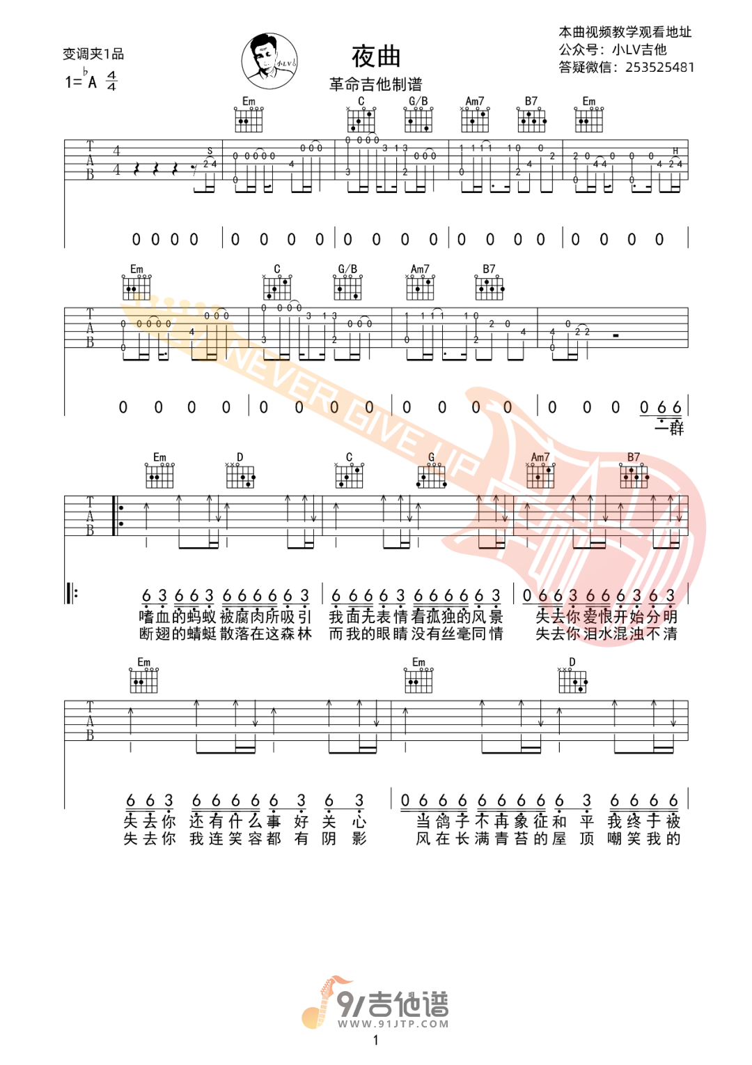 曲谱介绍: 曲谱简介:夜曲吉他谱 周杰伦原版六线谱 附带吉他弹唱教学,《夜曲》是由周杰伦演唱的一首歌曲,由方文山作词,周杰伦作曲,林迈可编曲。这首歌讲述的是一个关于爱人离去后的故事,虽然周董的吐词非常的不清晰,但是却刚刚好唱出了那种缠绵悱恻的心痛之感,整首歌将RAp和抒情结合的很好,意境相当的完美。