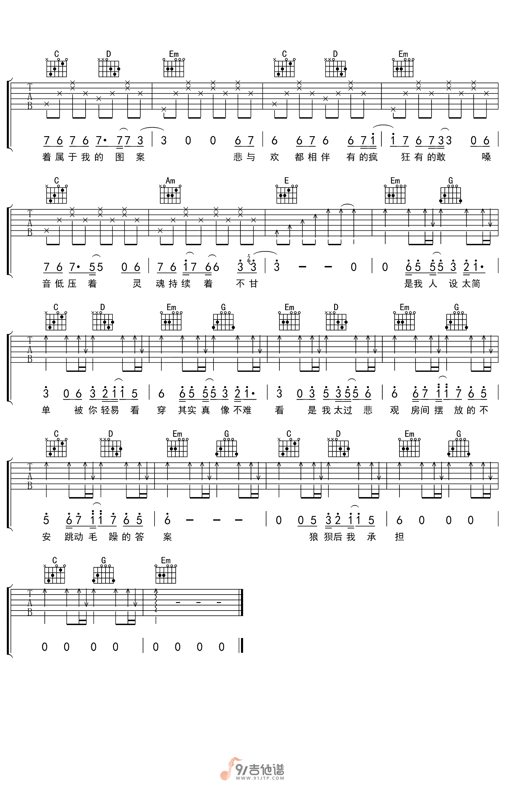 曲谱介绍: 曲谱简介:人设吉他谱,孟凡明演唱的一首歌曲,4/4拍的节奏,这首歌曲的原调为G调,这里曲谱采用了G调指法进行编配,演唱时可不夹变调夹,曲谱由琴谱网更新上传,共2张高清图片弹唱吉他谱例,曲谱来源于网络转载,编配制谱者暂不详。独立的配器尝试,节奏跳跃的属性,更直观的表达对自我人设的态度,让你看到属于他的更多可能。