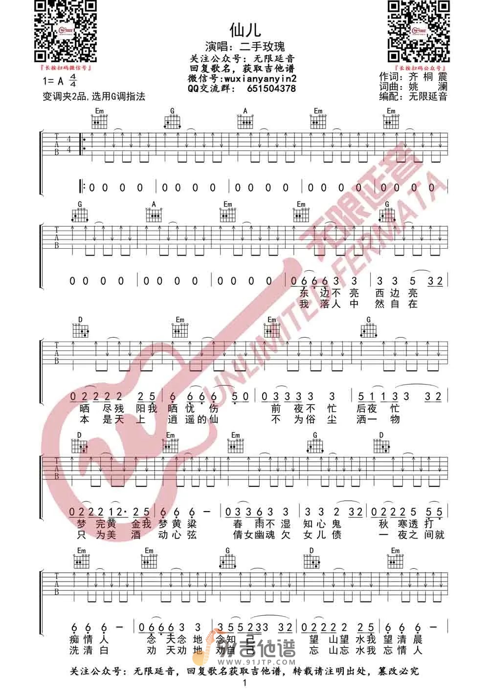 曲谱介绍: 曲谱简介:仙儿吉他谱 二手玫瑰原版吉他弹唱六线谱,《仙儿》是由二手玫瑰乐队演唱的一首歌曲,这首歌你说它摇滚吧,好像并没有那种让人冲动,血脉张扬的感觉,反而它更像是东北的二人传的新演绎。这确实也是二手玫瑰一直在努力推广的,即东北二人转与现代的摇滚乐的有机结合。歌曲原调为A调,这里采用了G调指法进行编配,演唱时夹变调夹2品可回到原调。