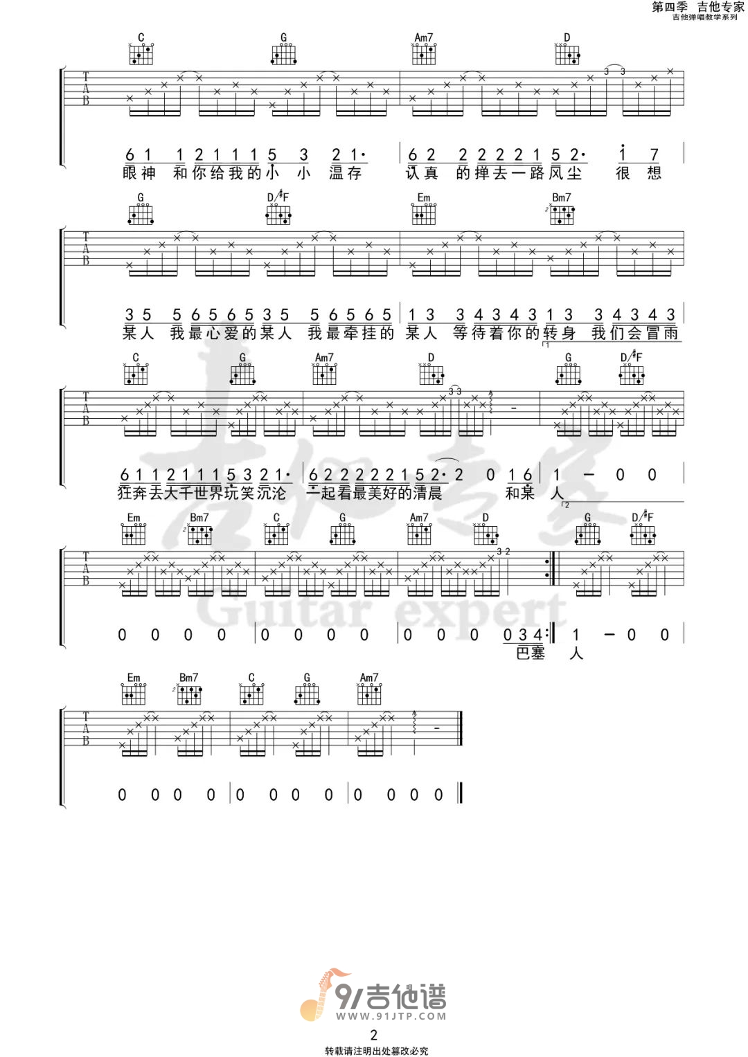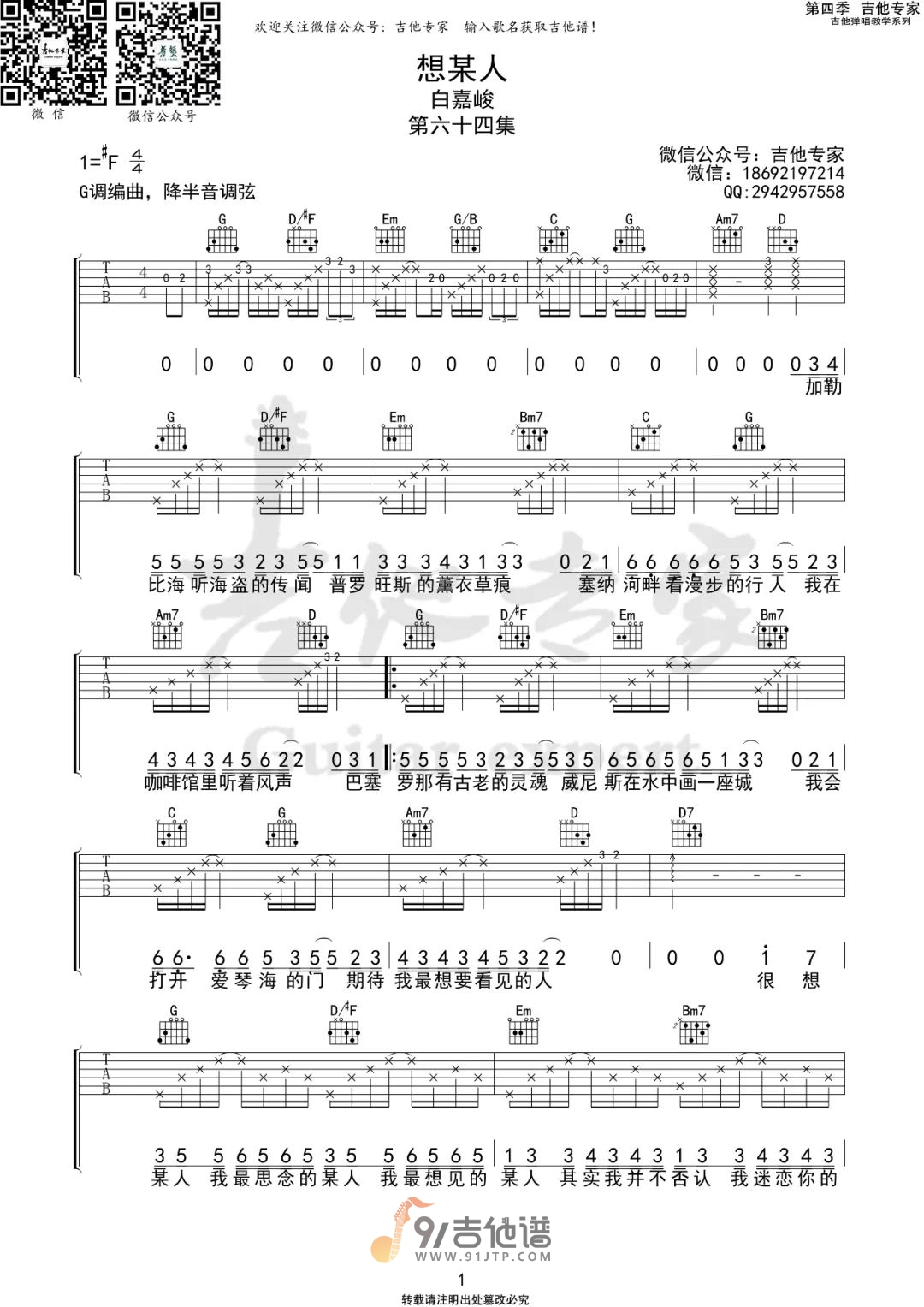 曲谱介绍: 曲谱简介:《想某人》是由邢榕作词、作曲,白嘉峻演唱的歌曲,对某人的思念总是会在不经意间的想起,看遍世界最好的风景,就是身边有你。歌曲原调为#F调,这里采用了G调指法进行编配,演唱时降半音调弦可以回到原调,也可以根据自己的嗓音情况夹合适的变调夹品位。