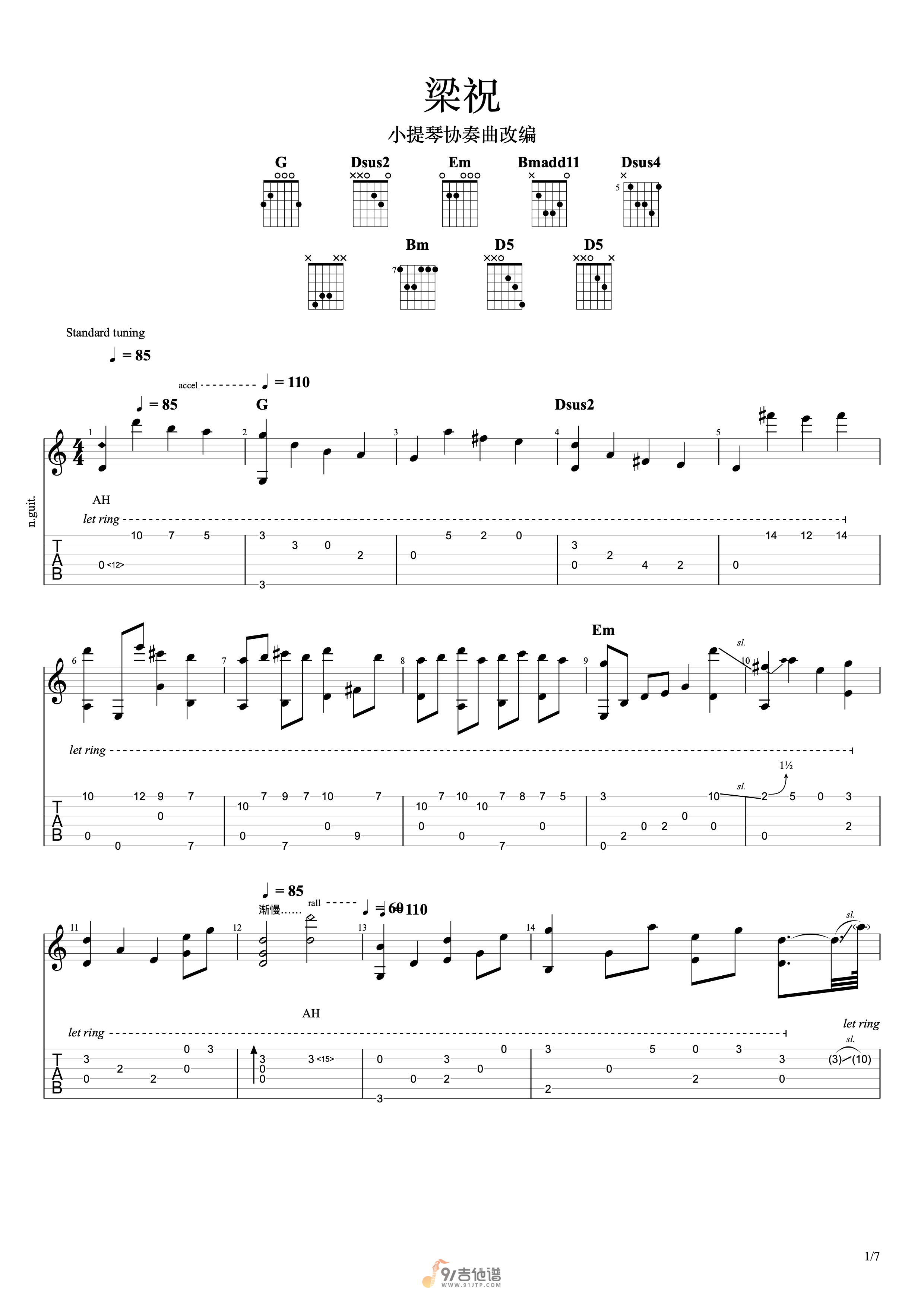 梁祝吉他谱 - 吉他独奏谱 - 原版