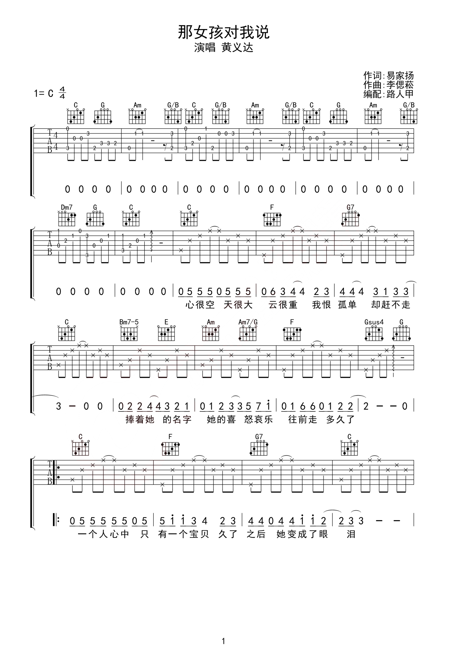 曲谱介绍: 黄义达《那女孩对我说》吉他谱_C调吉他弹唱谱