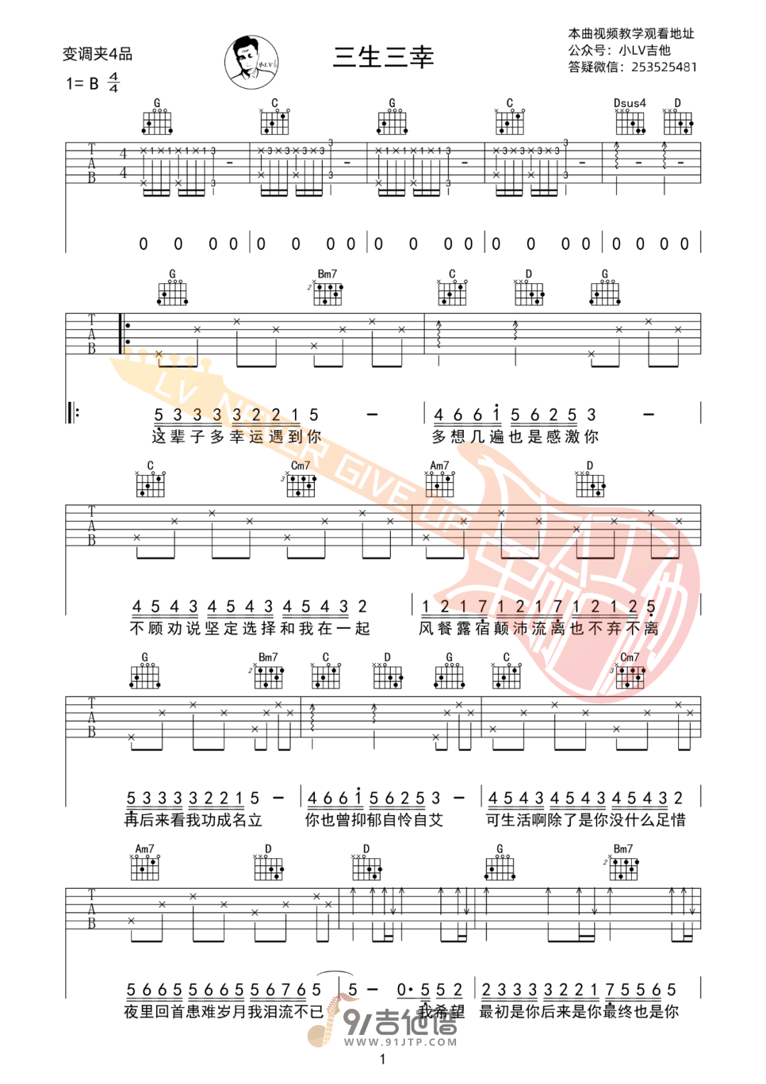 曲谱介绍: 曲谱简介:三生三幸吉他谱,海来阿木演唱的一首歌曲,4/4拍的节奏,这首歌曲的原调为B调,这里曲谱采用了G调指法进行编配,演唱时夹变调夹4品可回到原调,也可根据个人实际嗓音情况选择。曲谱由革命吉他编配出品。这首歌是海来阿木为自己的婚姻写的一首歌曲,从一开始的一无所有不顾父母反对在一起,在出租屋里给爱人用硬纸壳扇扇子,到后面事业有所起色后无法家庭事业兼顾,直到现在相依相伴约定白首不相离。