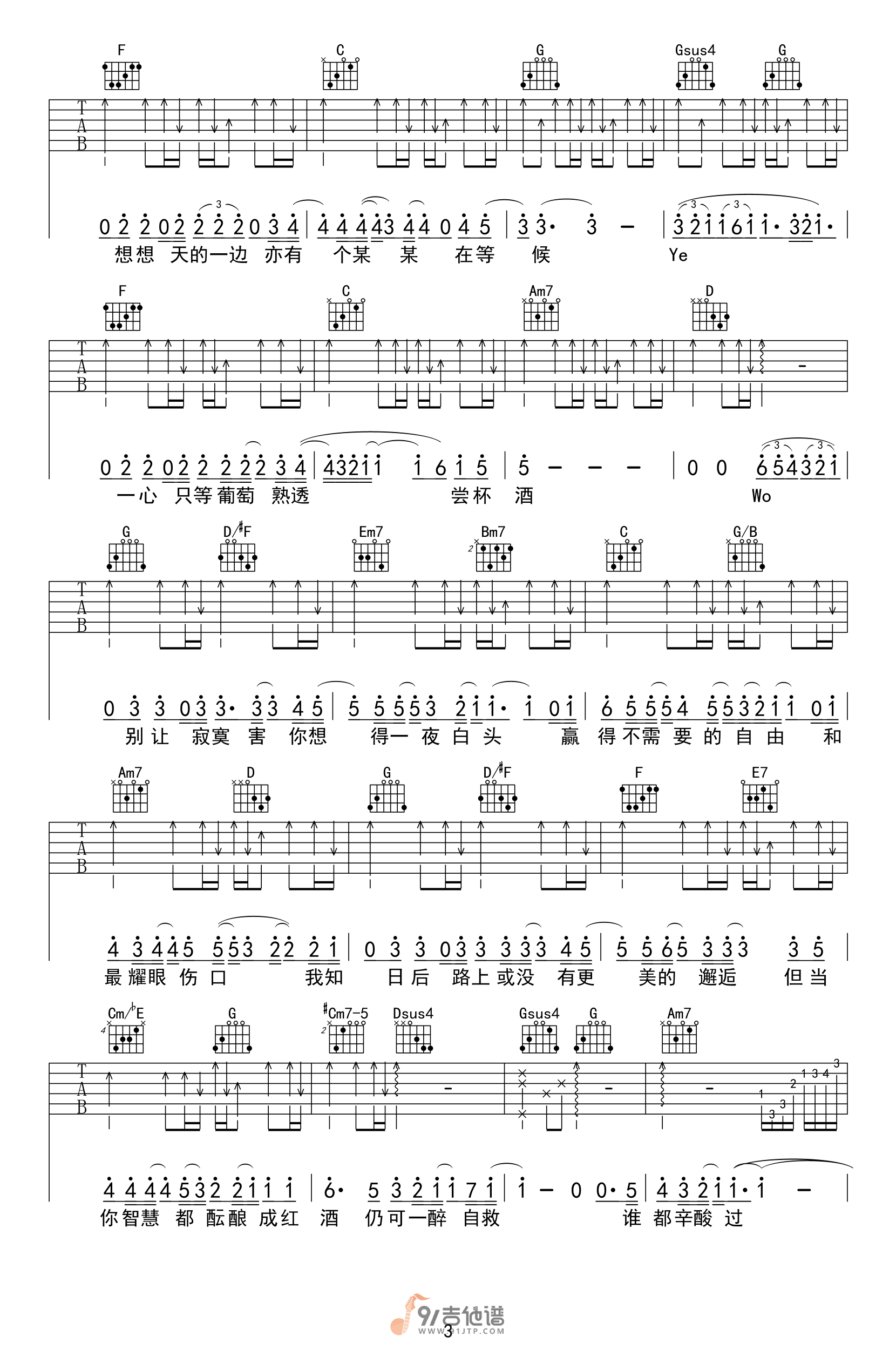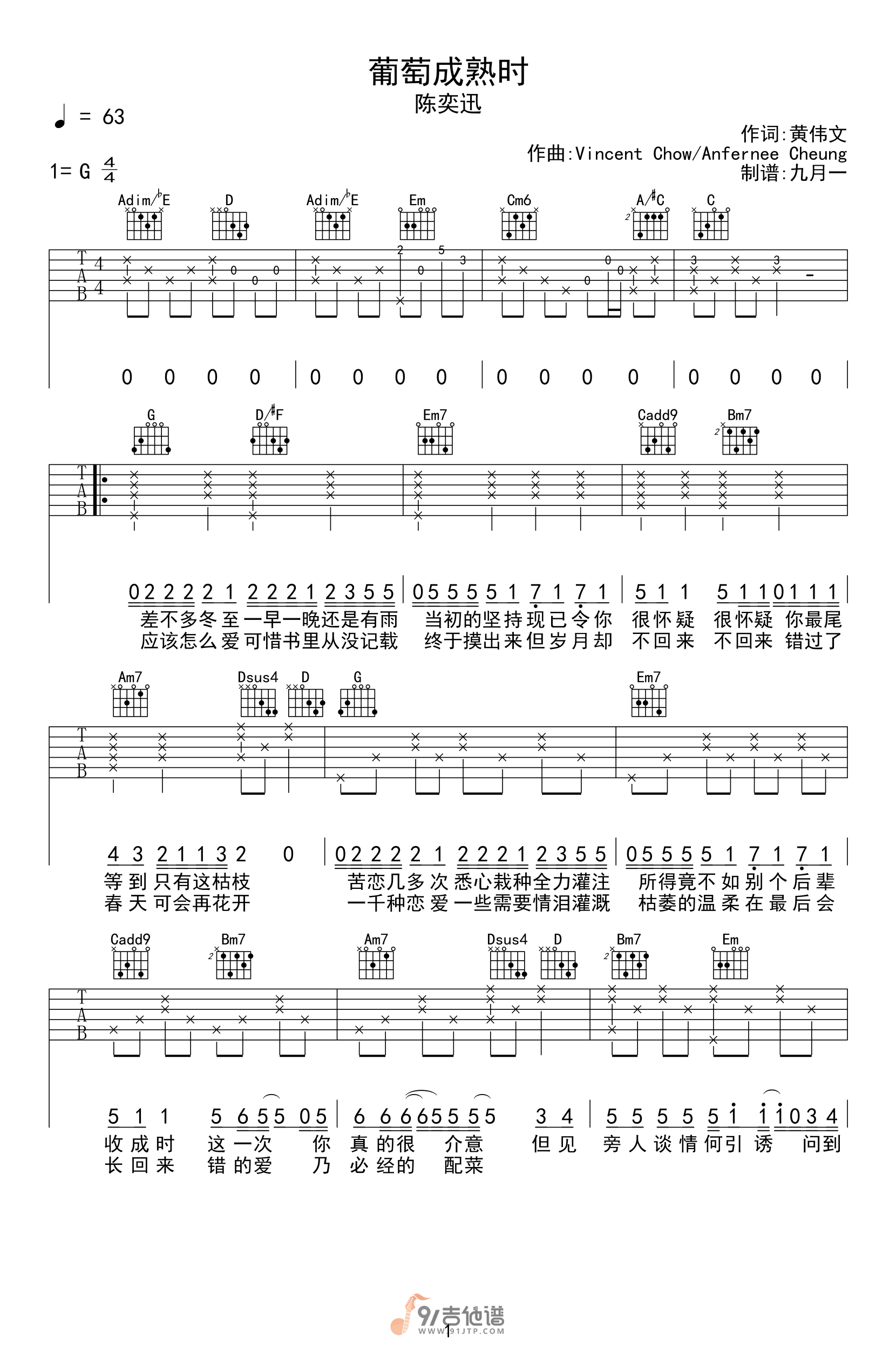 曲谱介绍: 曲谱简介:葡萄成熟时吉他谱,陈奕迅演唱的一首歌曲,4/4拍的节奏,这首歌曲的原调为G调,这里曲谱采用了G调指法进行编配,演唱时可不夹变调夹,曲谱由九月一编配出品。Eason的歌里充满了遗憾和无奈的坚守,好像每个人的爱情都是碰到爱情时是青葡萄,但未到葡萄丰收的季节,当你用心栽培到葡萄成熟时,你却已失去丰收的权力了。