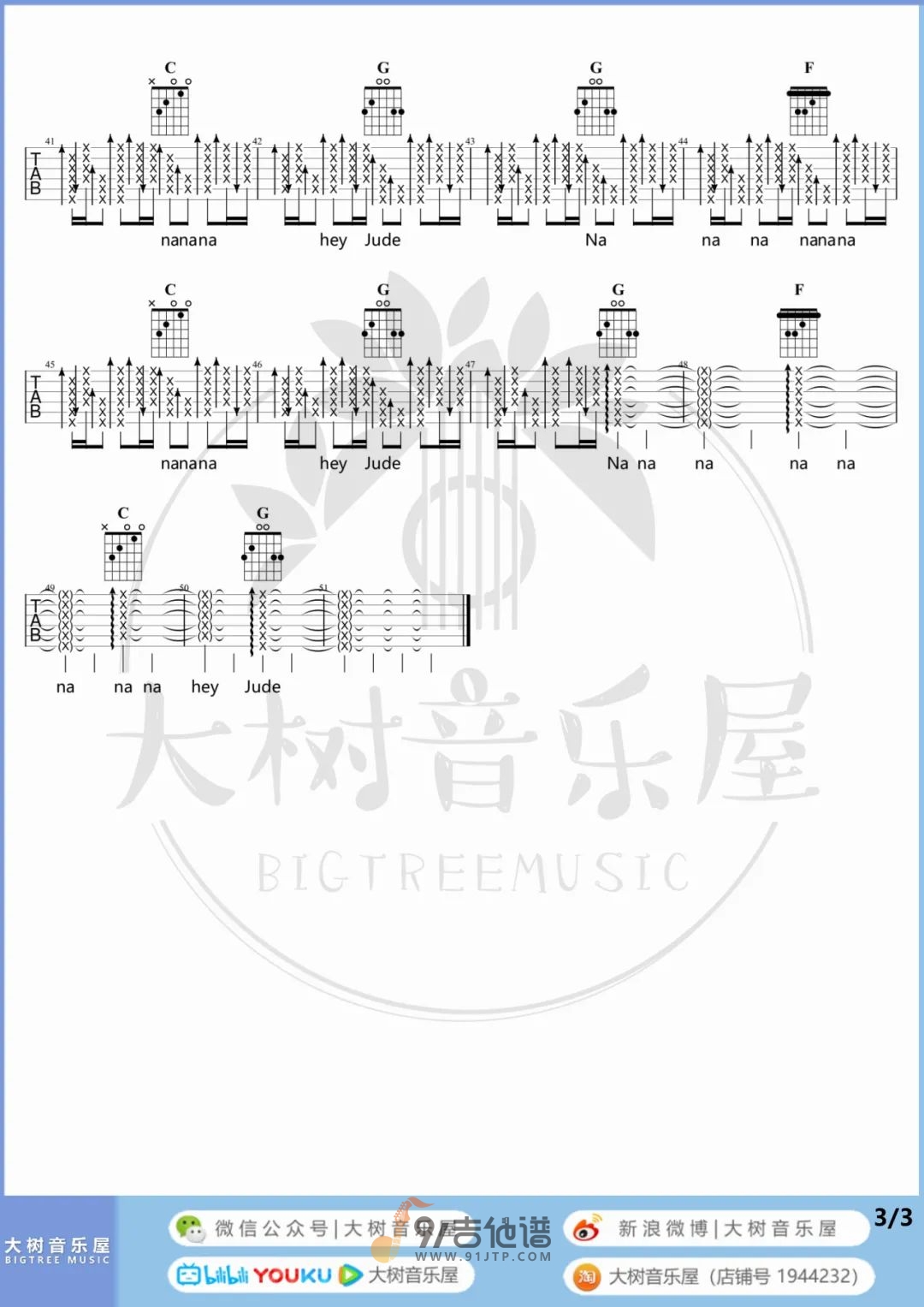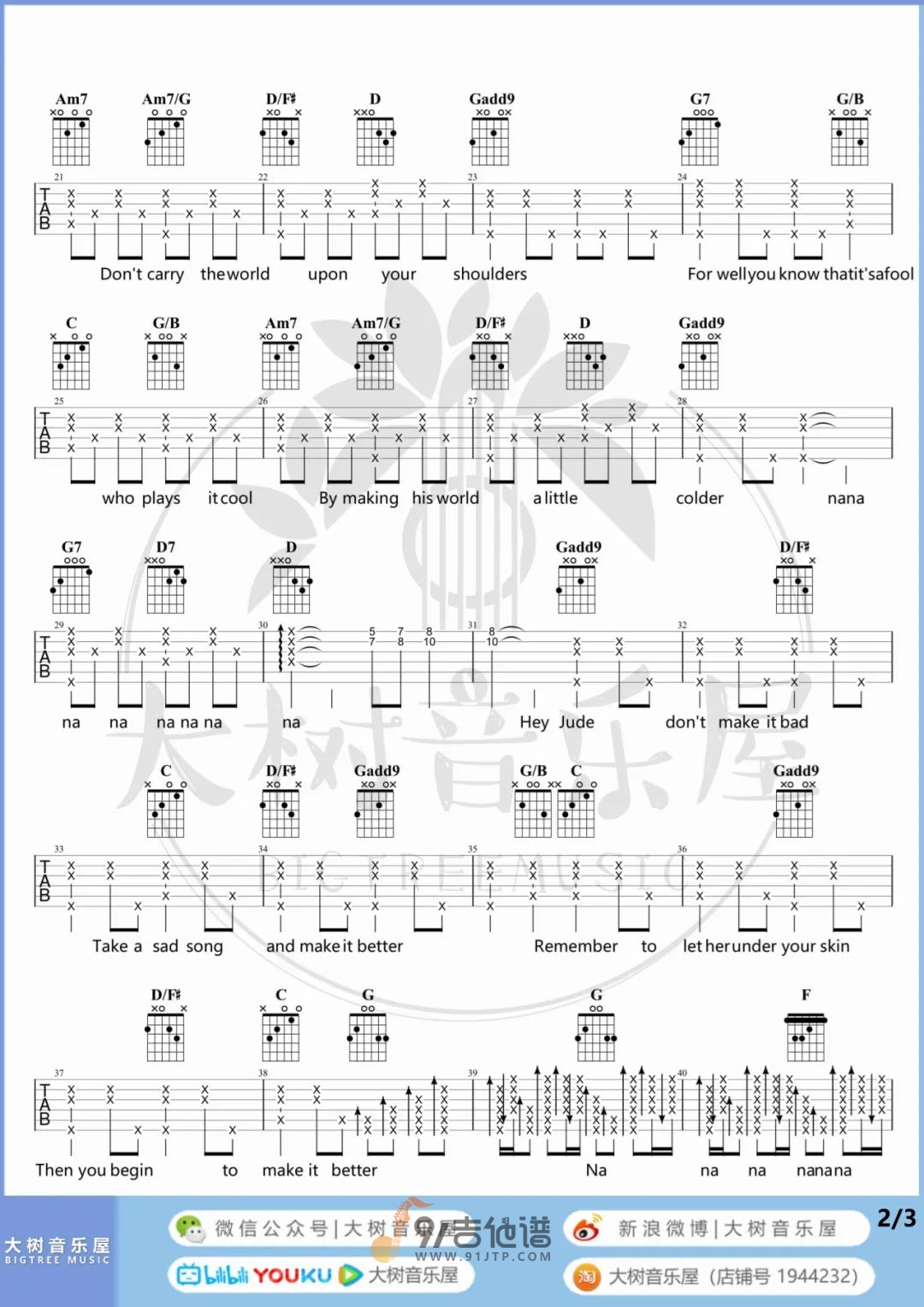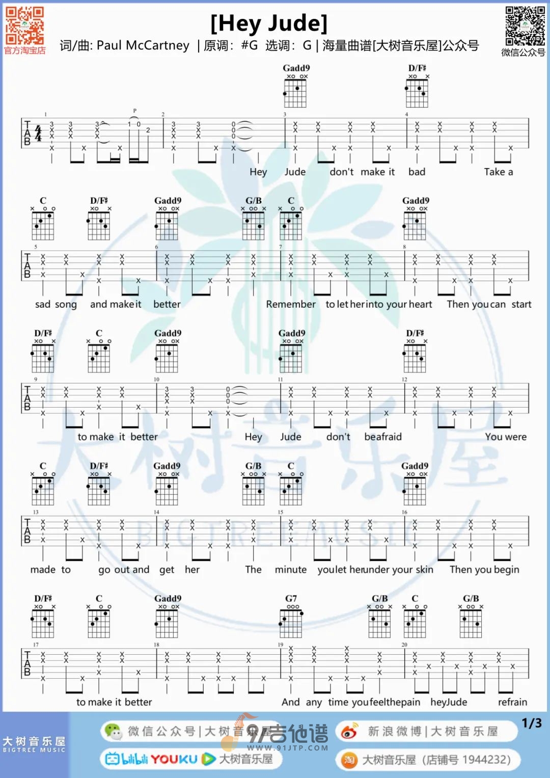 曲谱介绍: 曲谱简介:孙燕姿版《Hey Jude》吉他谱 附带弹唱教学,《Hey Jude》是英国乐队披头士演唱的一首经典歌曲,这里是孙燕姿的版本。通过“反复”的手段拉长了该曲的篇幅,同时,其简单通俗而又内涵丰富的歌词,既能轻易打破英美两种文化间的隔阂,同时又在两种文化间激起了迥异的想象。
