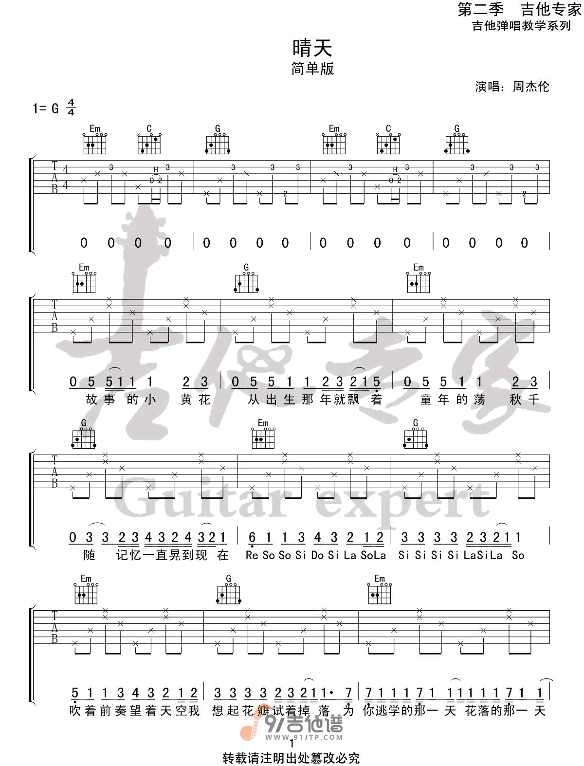 曲谱介绍: 曲谱简介:晴天吉他谱,周杰伦演唱的一首歌曲,4/4拍的节奏,这首歌曲的原调为G调,这里曲谱采用了G调指法进行编配,演唱时可不夹变调夹,曲谱由吉他专家编配出品。这是首浪漫的少年情歌,有风花雪月,更多的是怅然若失,很散文诗式的情怀,用周杰伦的方式演绎,就更带点伤感。
