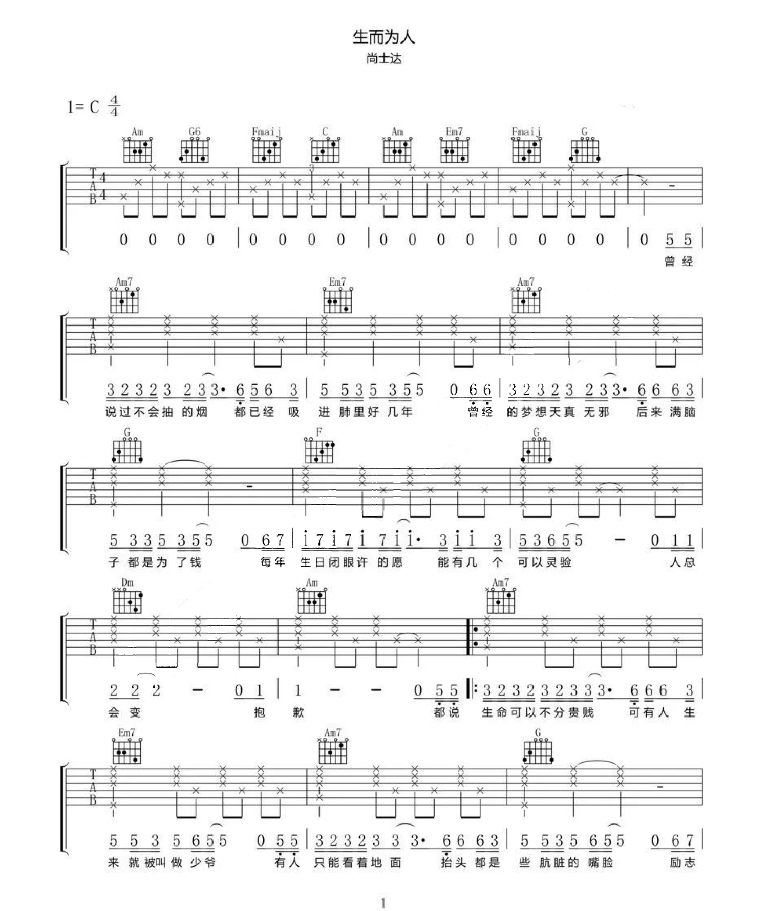 曲谱介绍: 尚士达《生而为人》吉他谱_C调吉他弹唱谱