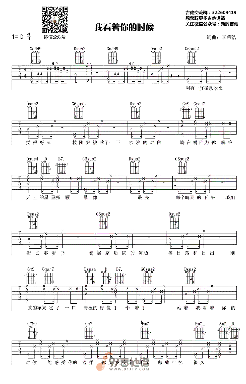 曲谱介绍: 曲谱简介:我看着你的时候吉他谱,李荣浩演唱的一首歌曲,4/4拍的节奏,这首歌曲的原调为D调,这里曲谱采用了D调指法进行编配,演唱时可不夹变调夹,曲谱由新辉吉他编配出品。歌曲主旋律是轻缓的,男低音的温柔和男中音抒情都被荣以浩特别的方式演绎出来。唱着一个青涩且温馨的故事,像不像我们当初的样子?