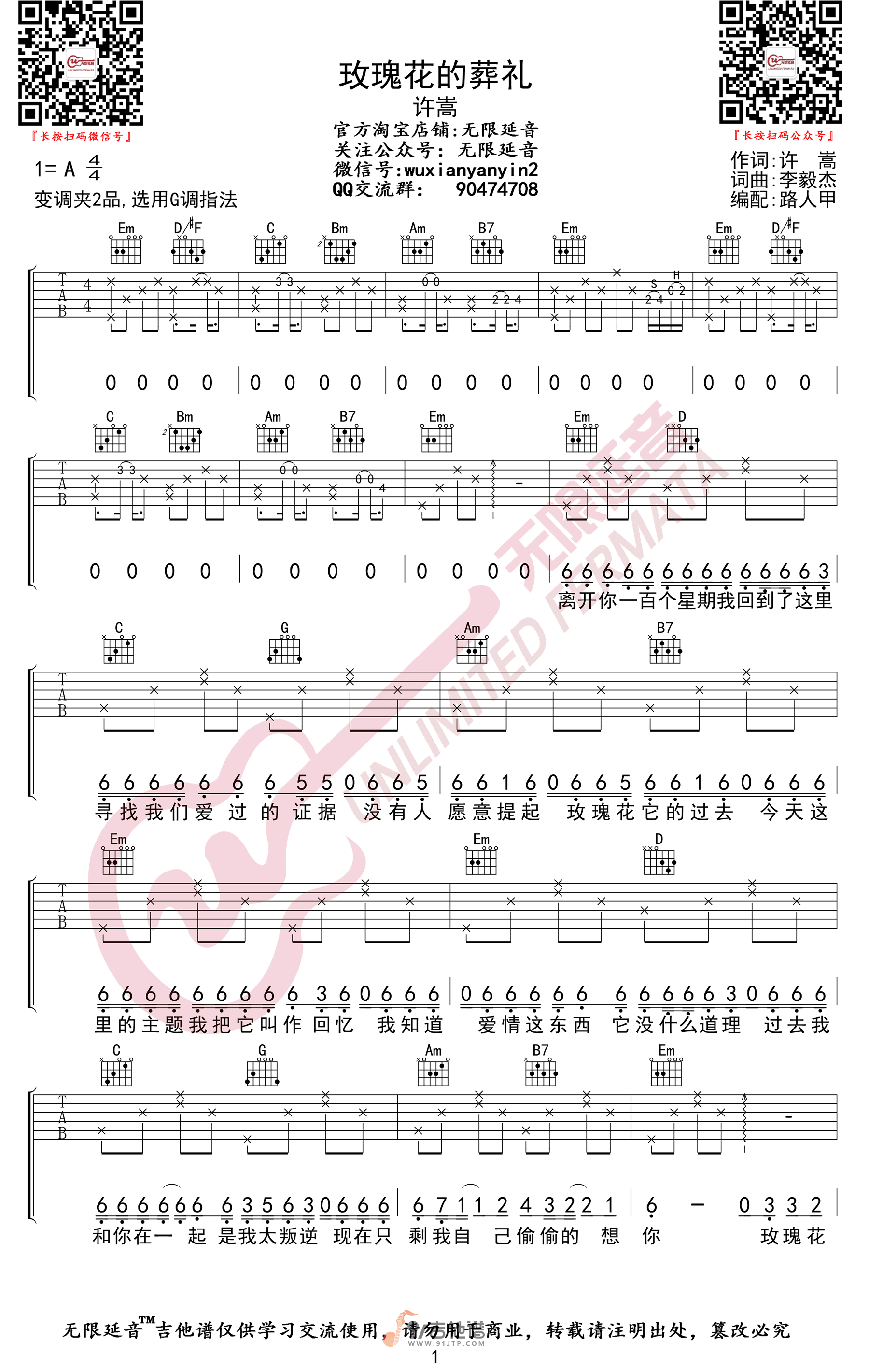 曲谱介绍: 曲谱简介:玫瑰花的葬礼吉他谱,许嵩演唱的一首歌曲,4/4拍的节奏,这首歌曲的原调为A调,这里曲谱采用了G调指法进行编配,演唱时夹变调夹2品可回到原调,也可根据个人实际嗓音情况选择。曲谱由无限延音编配出品。这首歌可以说是许嵩的成名曲了,歌曲节奏强烈,低吟的诉说方式表达了一种伤感的情怀,它受到了相当广泛的好评。