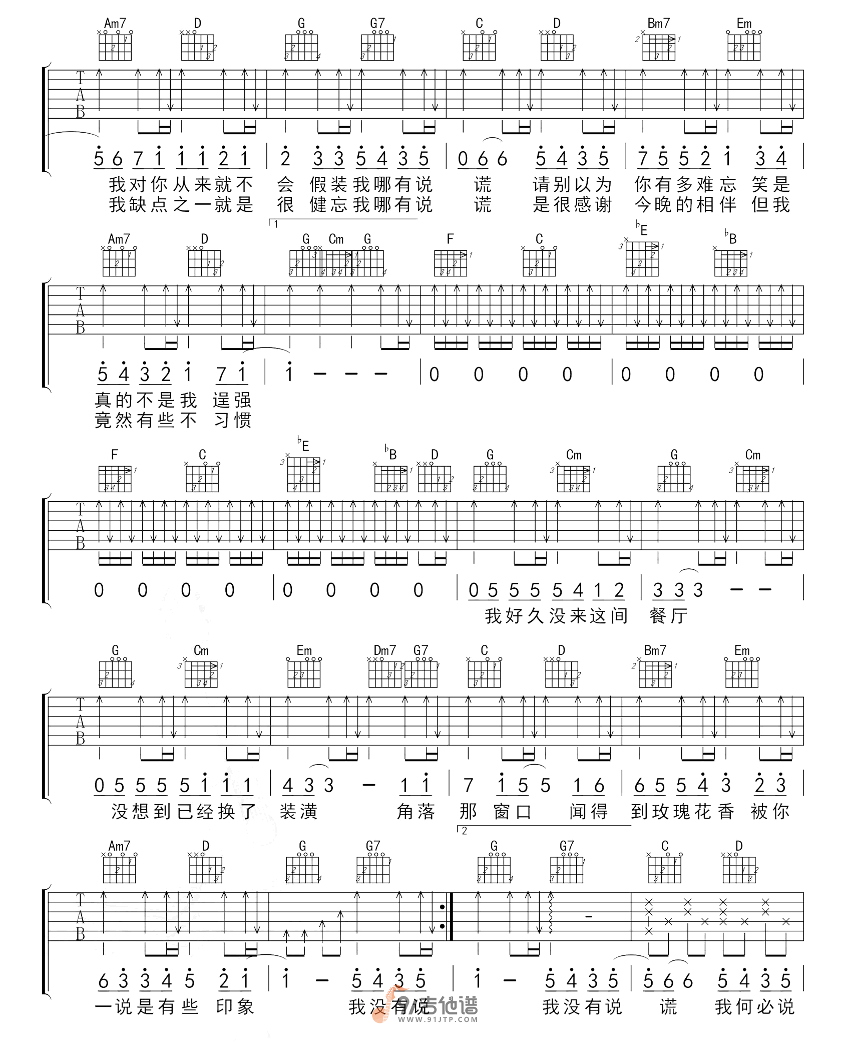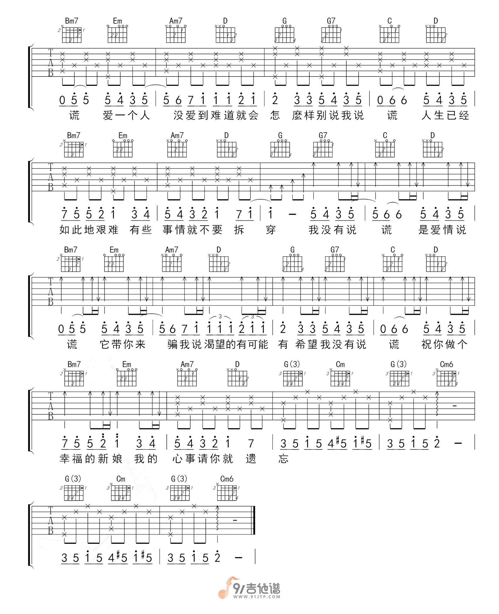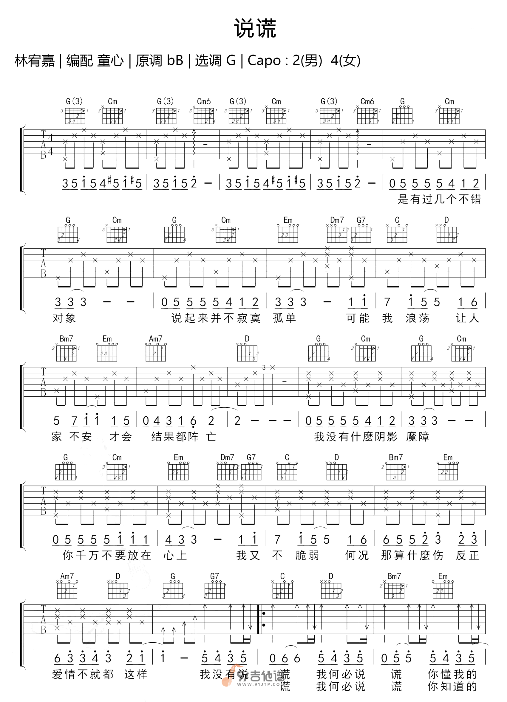 曲谱介绍: 曲谱简介:说谎吉他谱,林宥嘉演唱的一首歌曲,4/4拍的节奏,这首歌曲的原调为降B调,这里曲谱采用了G调指法进行编配,演唱时夹变调夹3品可回到原调,也可根据个人实际嗓音情况选择。曲谱由童心编配出品。这首歌曲我想用百听不厌去形容,作为林宥嘉的代表作着之一,歌曲的硬件无可挑剔,无论是编曲、作词,还是对歌曲的故事性填充,这首歌曲都是可圈可点的。