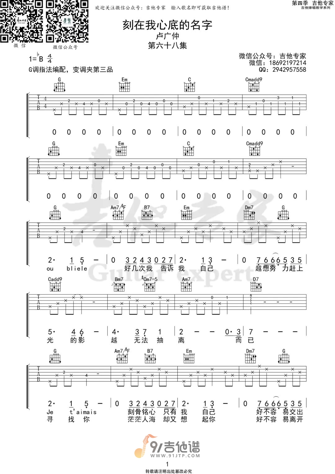 曲谱介绍: 曲谱简介:刻在我心底的名字吉他谱,卢广仲演唱的一首歌曲,4/4拍的节奏,这首歌曲的原调为降B调,这里曲谱采用了G调指法进行编配,演唱时夹变调夹3品可回到原调,也可根据个人实际嗓音情况选择。曲谱由吉他专家编配出品。这首歌是电影《刻在你心底的名字》的主题曲,短短的一首歌,便描述了整个故事,该曲动人的歌词与旋律贯穿了故事始终,歌曲最后一段清唱更是深入人心。