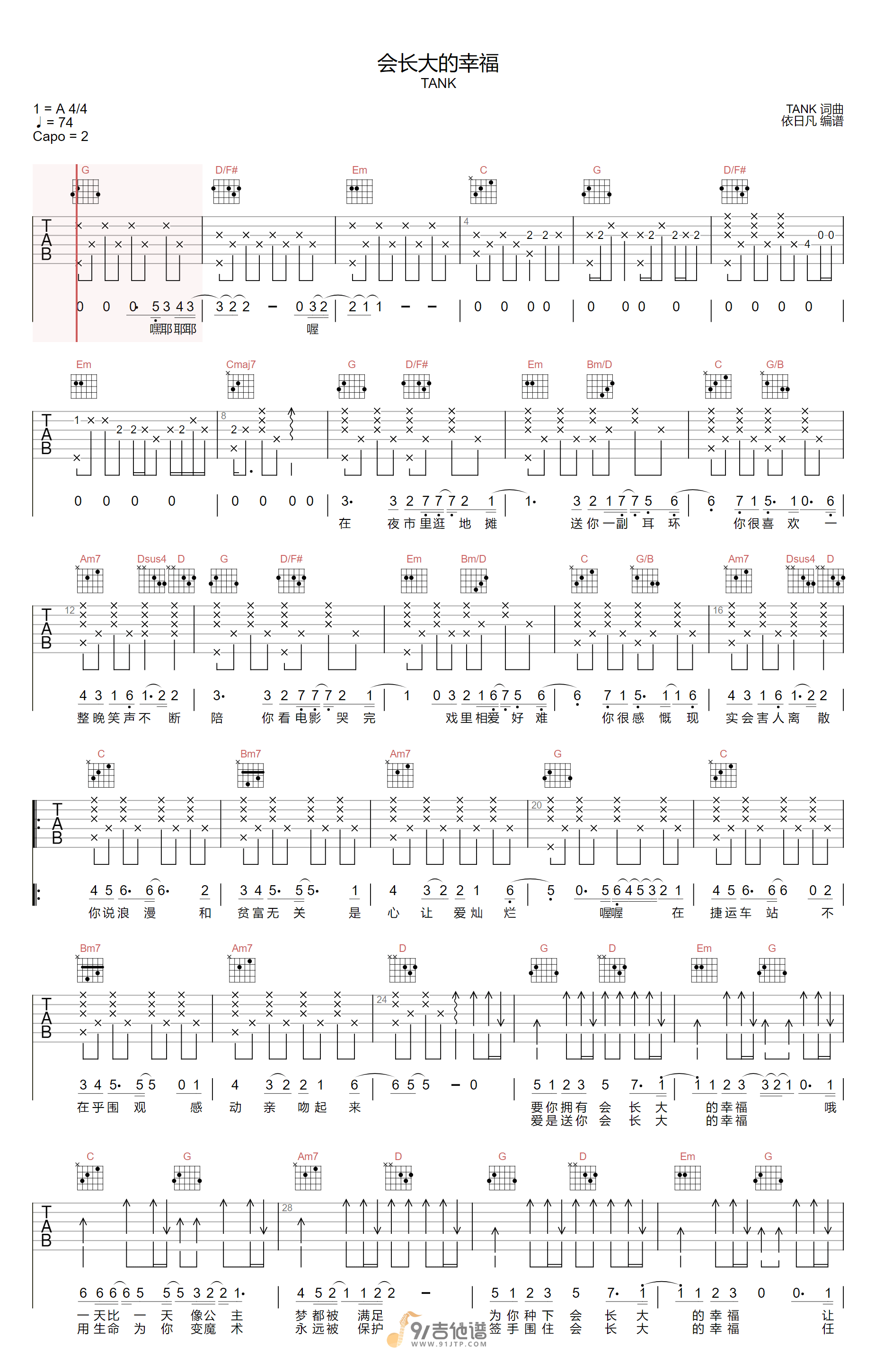 曲谱介绍: 曲谱简介:会长大的幸福吉他谱,Tank演唱的一首歌曲,4/4拍的节奏,这首歌曲的原调为A调,这里曲谱采用了G调指法进行编配,演唱时夹变调夹2品可回到原调,也可根据个人实际嗓音情况选择。曲谱由依日凡编配出品。这首歌是Tank的专辑《第三回合》热门歌曲之一,这首歌的歌词讲述的是一个现实而又浪漫的爱情,是会长大的幸福。