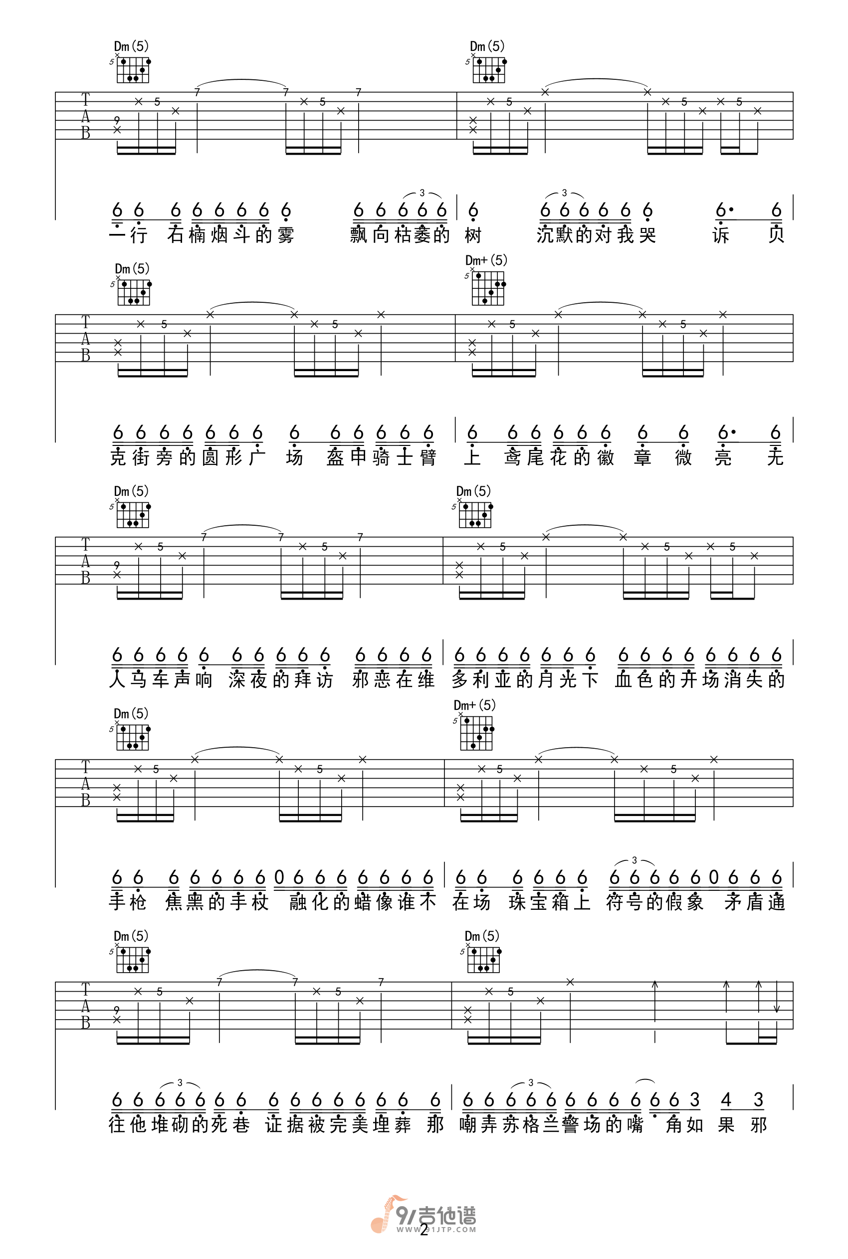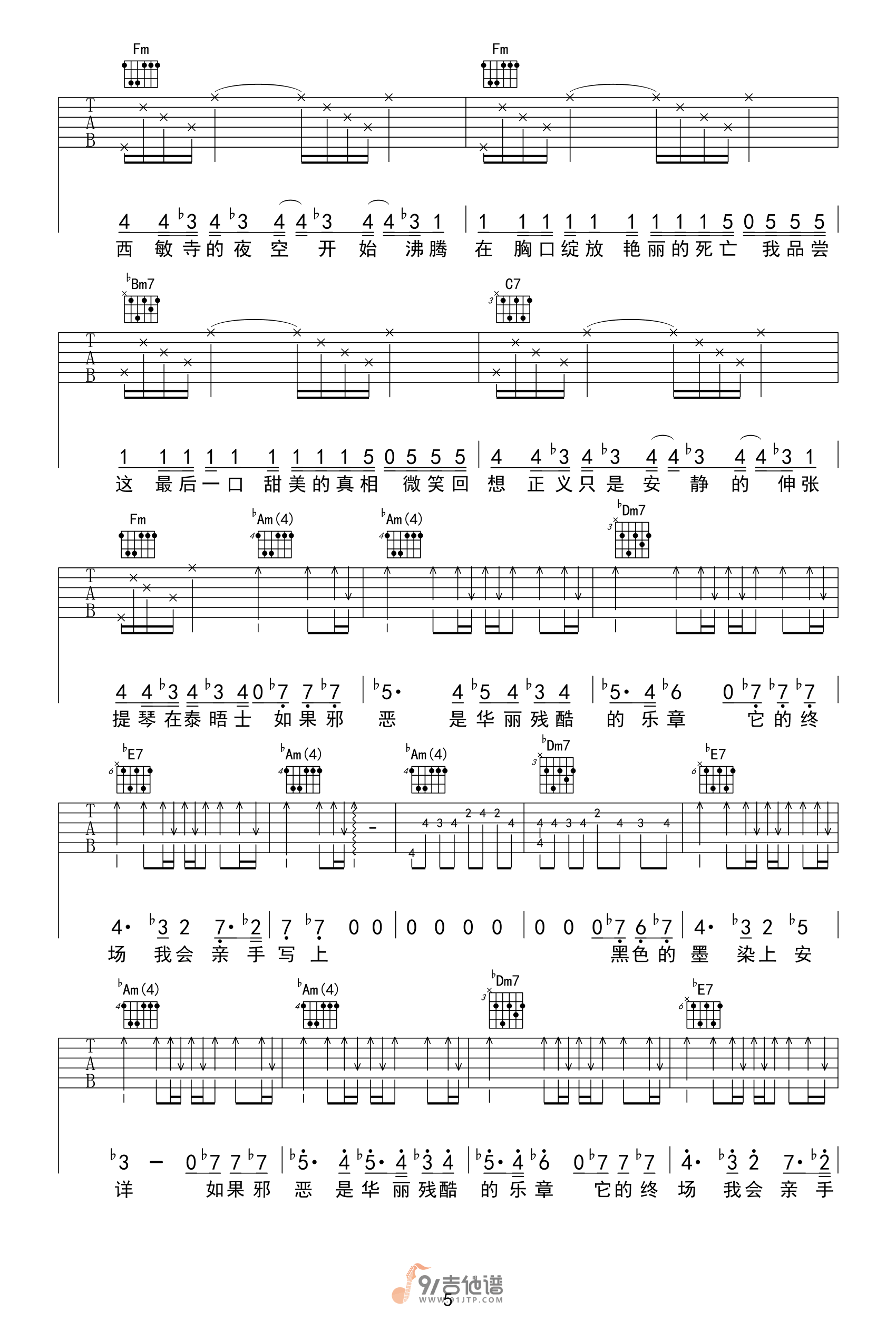 曲谱介绍: 曲谱简介:夜的第七章吉他谱,周杰伦演唱的一首歌曲,4/4拍的节奏,这首歌曲的原调为F调,这里曲谱采用了F调指法进行编配,演唱时可不夹变调夹,曲谱由M君编配出品。周杰伦刻意压低的硬嗓唱法搭配幽幽女高音,暗示着侦探的冷静与凶手的疯狂,乐曲到最后听见周杰伦以假音唱完,呈现流行音乐中难得一见的电影配乐格局。