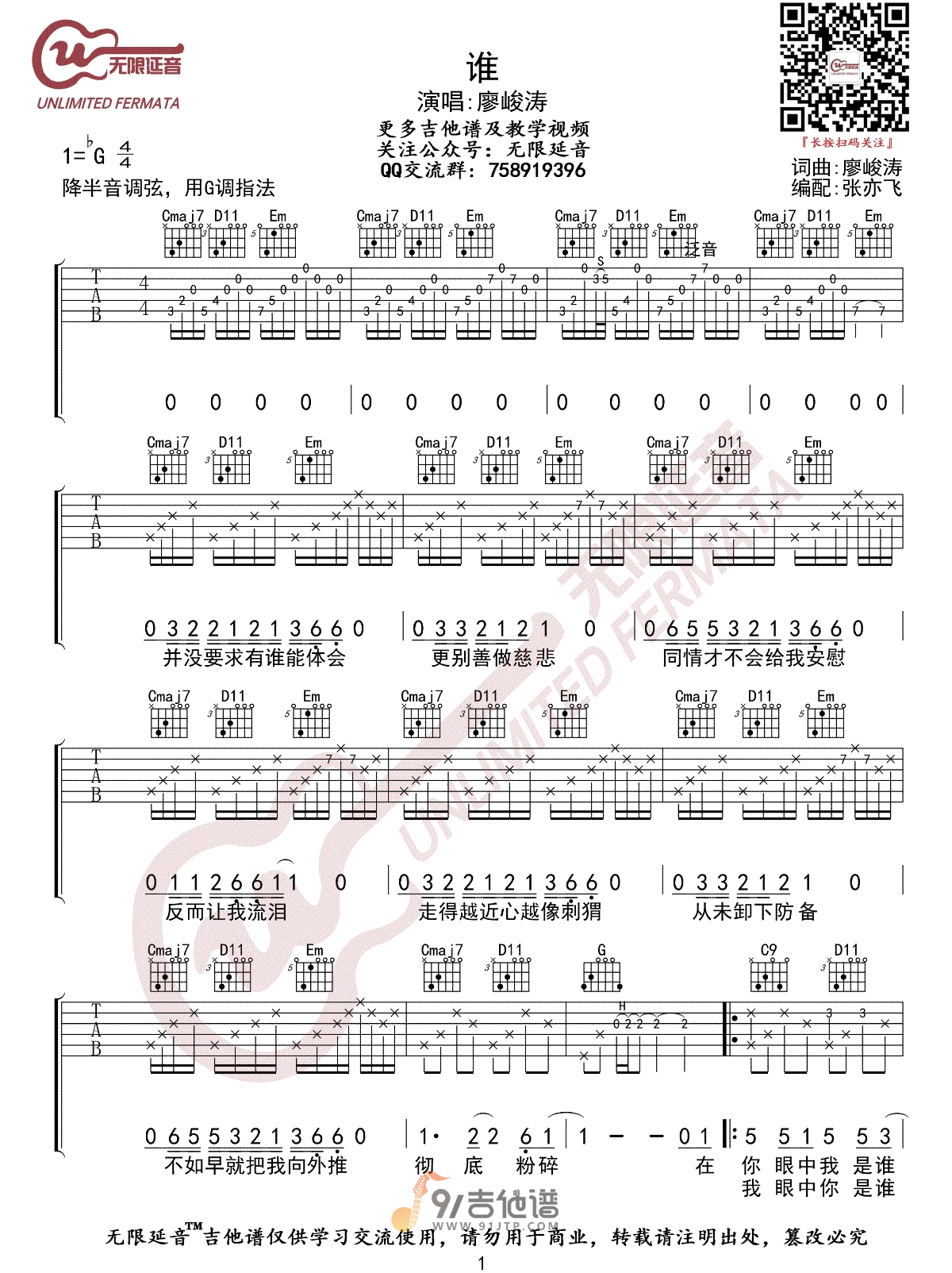 曲谱介绍: 曲谱简介:谁吉他谱,廖俊涛演唱的一首歌曲,4/4拍的节奏,这首歌曲的原调为#F调,这里曲谱采用了G调指法进行编配,演唱时降半音调弦可回到原调,也可根据个人实际嗓音情况选择不降音或夹几品。曲谱由无限延音编配出品。这首歌是廖俊涛在《明日之子》上演唱,歌中的经历虽不是廖俊涛自己经历过的,但歌词给人的感觉很有深度,对爱也有一种很透切的见解。