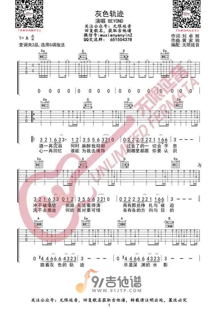 曲谱介绍: 曲谱简介:灰色轨迹吉他谱,Beyond演唱的一首歌曲,4/4拍的节奏,这首歌曲的原调为A调,这里曲谱采用了G调指法进行编配,演唱时夹变调夹2品可回到原调,也可根据个人实际嗓音情况选择。曲谱由无限延音编配出品。灰色轨迹的音乐总是耐人寻味,完美的用电吉他演绎了歌曲的内涵,此处真是无声胜有声啊。