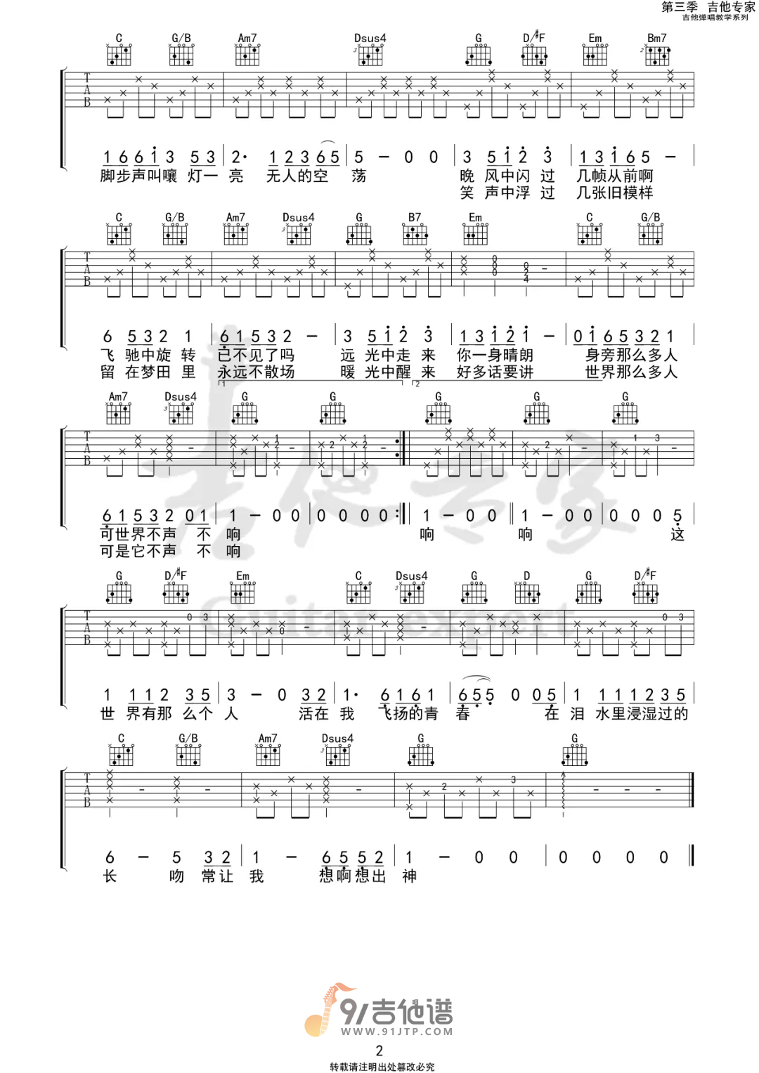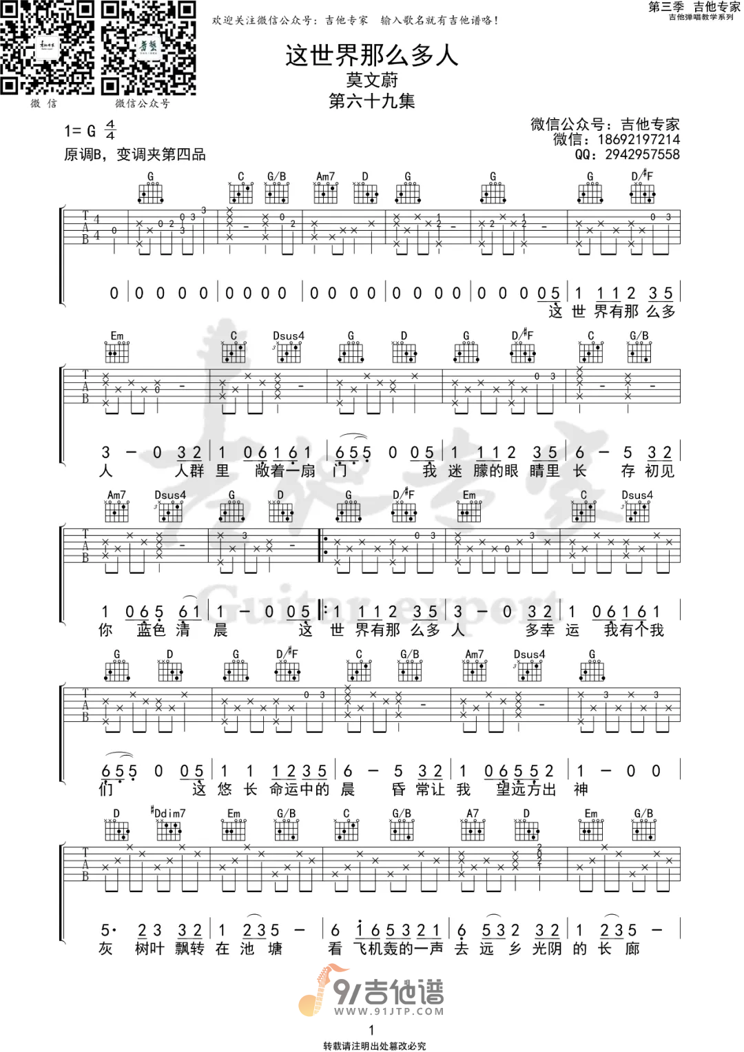 曲谱介绍: 曲谱简介:这世界那么多人吉他谱,莫文蔚演唱的一首歌曲,4/4拍的节奏,这首歌曲的原调为B调,这里曲谱采用了G调指法进行编配,演唱时夹变调夹4品可回到原调,也可根据个人实际嗓音情况选择。曲谱由吉他专家编配出品。这首歌歌词触动人心,曲调悠长,整体呈现出低声诉说爱情冷暖的独特气质,更需要一位细腻且极具感染力的歌手才能完美演绎。