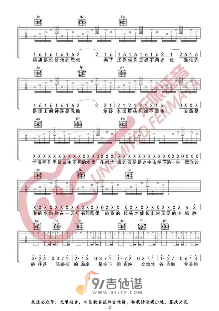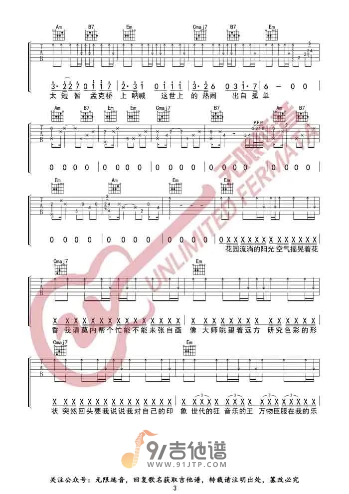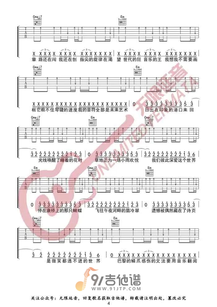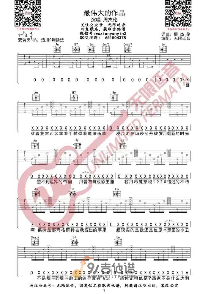 曲谱介绍: 曲谱简介:最伟大的作品吉他谱,周杰伦演唱的一首歌曲,4/4拍的节奏,这首歌曲的原调为降B调,这里曲谱采用了G调指法进行编配,演唱时夹变调夹3品可回到原调,也可根据个人实际嗓音情况选择。曲谱由无限延音编配出品。这首新歌周杰伦融合了说唱、流行、古典等多种音乐元素,依然有着浓郁的周杰伦Style。MV更是艺术感拉满,融合绘画、文学、音乐等元素,为我们介绍了这些伟大艺术品的诞生。