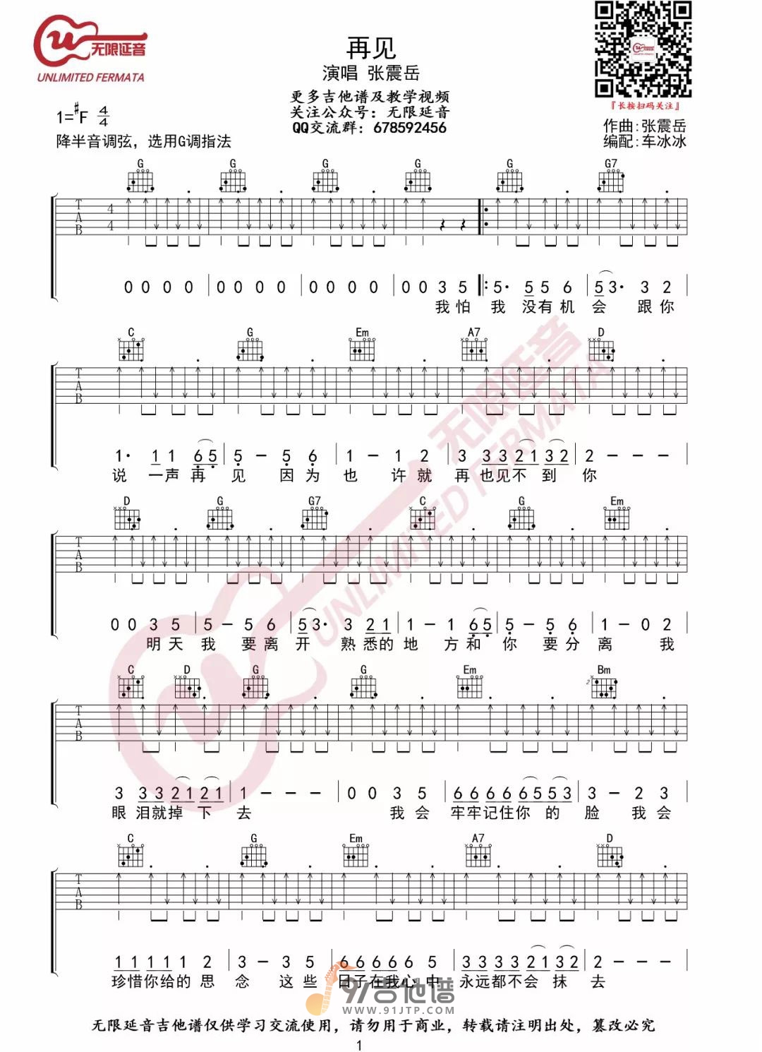 曲谱介绍: 曲谱简介:再见吉他谱,张震岳演唱的一首歌曲,4/4拍的节奏,这首歌曲的原调为#F调,这里曲谱采用了G调指法进行编配,演唱时降半音调弦可回到原调,也可根据个人实际嗓音情况选择不降音或夹几品。曲谱由无限延音编配出品。这首歌虽然歌词中充斥着离别的愁绪,但歌曲的旋律却是很欢乐,很好听的一首歌,律动感很强。