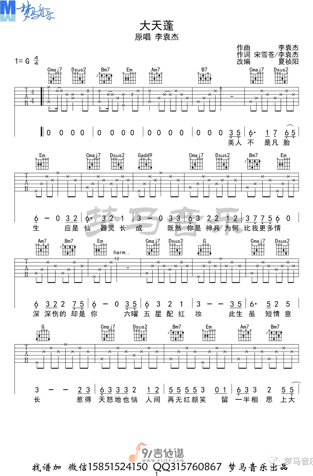 曲谱介绍: 曲谱简介:大天蓬吉他谱,李袁杰演唱的一首歌曲,4/4拍的节奏,这首歌曲的原调为G调,这里曲谱采用了G调指法进行编配,演唱时可不夹变调夹,曲谱由梦马音乐编配出品。这首歌是电影《大天蓬》的同名主题曲,这首歌歌词高度还原电影情节,讲述了猪八戒西行取经之前的一段曲折故事。歌曲婉转与电影气氛相得益彰,生动刻画了这段不为人知的感情。