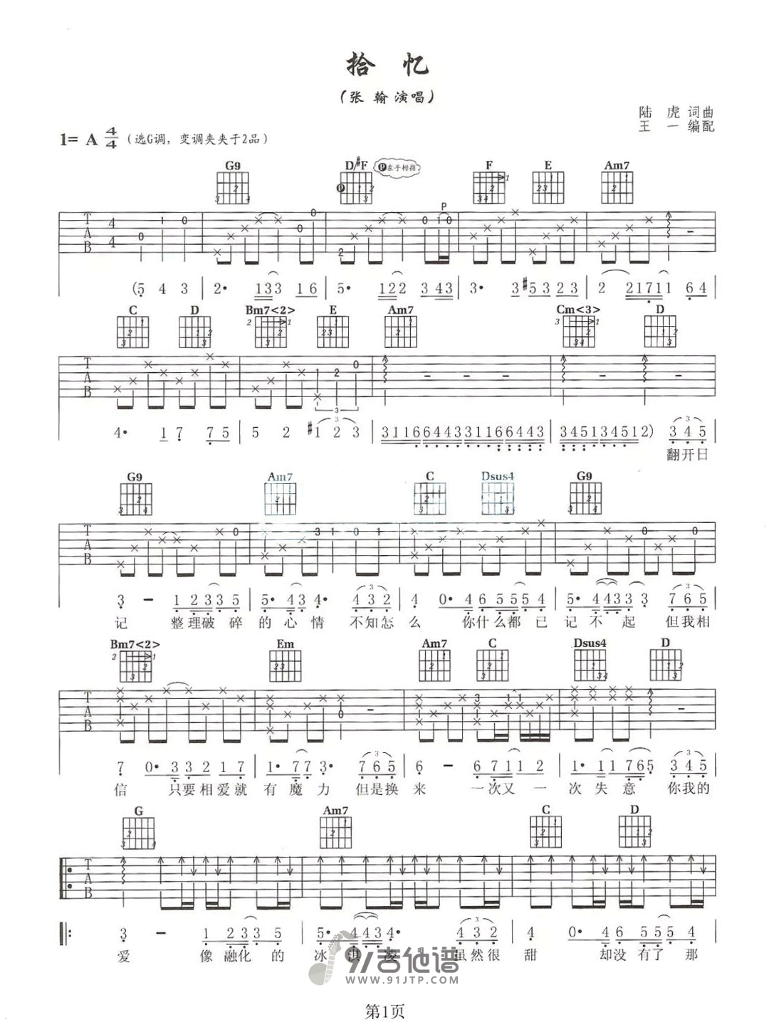 曲谱介绍: 曲谱简介:拾忆吉他谱,张翰演唱的一首歌曲,4/4拍的节奏,这首歌曲的原调为A调,这里曲谱采用了G调指法进行编配,演唱时夹变调夹2品可回到原调,也可根据个人实际嗓音情况选择。曲谱由王一编配出品。这首歌也是作为了早期热播电视剧《一起来看流星雨》的插曲,当时这首歌红极一时,现在听起来这首歌依旧是那么好听。