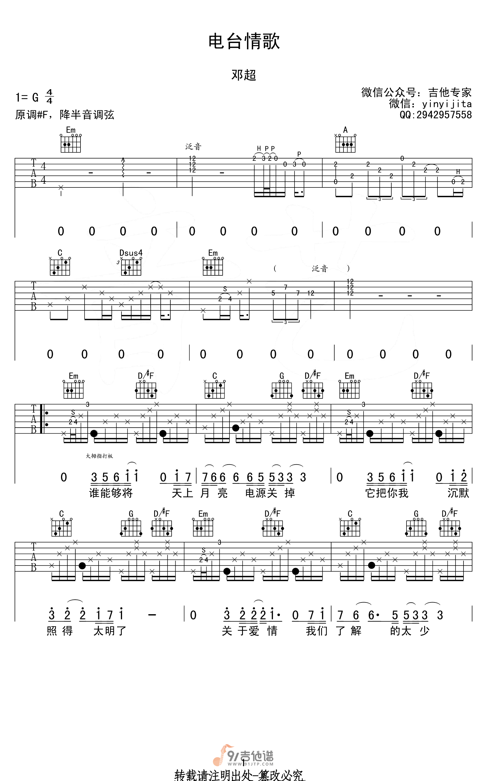 曲谱介绍: 曲谱简介:电台情歌吉他谱,莫文蔚演唱的一首歌曲,4/4拍的节奏,这首歌曲的原调为#F调,这里曲谱采用了G调指法进行编配,演唱时降半音调弦可回到原调,也可根据个人实际嗓音情况选择不降音或夹几品。曲谱由吉他专家编配出品。虽然超哥的唱功一般般,不过这首经典的歌曲编配得真心不错。按照原版编配的谱子更加适合一人弹奏,一人演唱。谱子中圆点表示右手大拇指击弦打板,间奏和尾奏的跨度有点大,而且速度偏快,要多多练习!