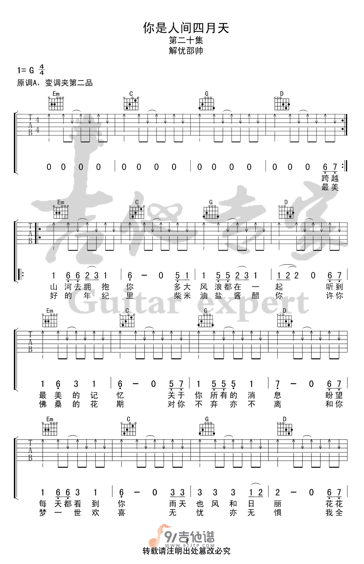 你是人间四月天吉他谱 - 解忧邵帅 - G调吉他弹唱谱 - 原版