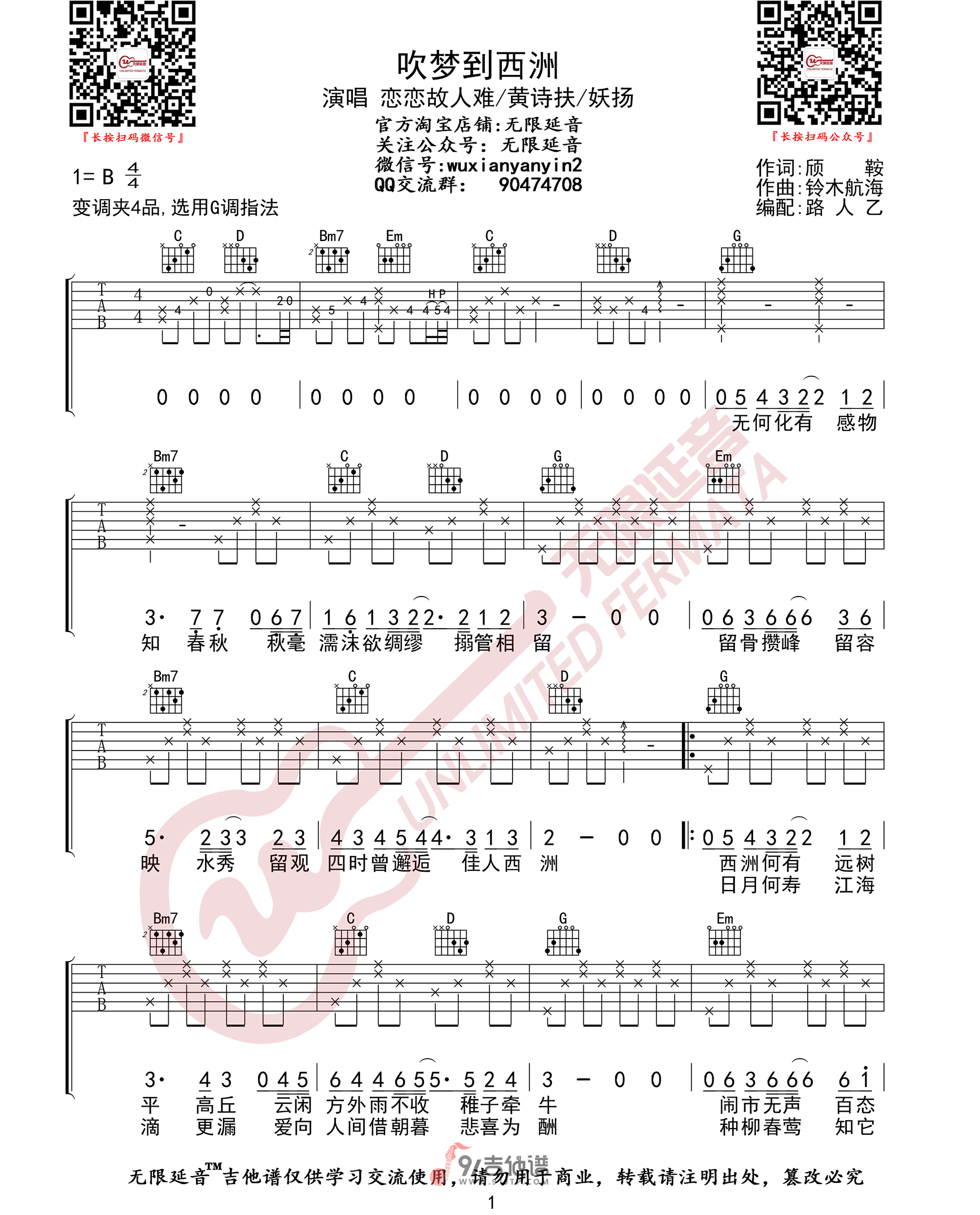 曲谱介绍: 曲谱简介:吹梦到西洲吉他谱,黄诗扶演唱的一首歌曲,4/4拍的节奏,这首歌曲的原调为B调,这里曲谱采用了G调指法进行编配,演唱时夹变调夹4品可回到原调,也可根据个人实际嗓音情况选择。曲谱由无限延音编配出品。这首歌的歌名取自南朝乐府民歌《西洲曲》,歌词清俊浪漫,大胆幻想,描绘了画中“西洲”这样一个幽暗不明、飘渺难求的桃花源。