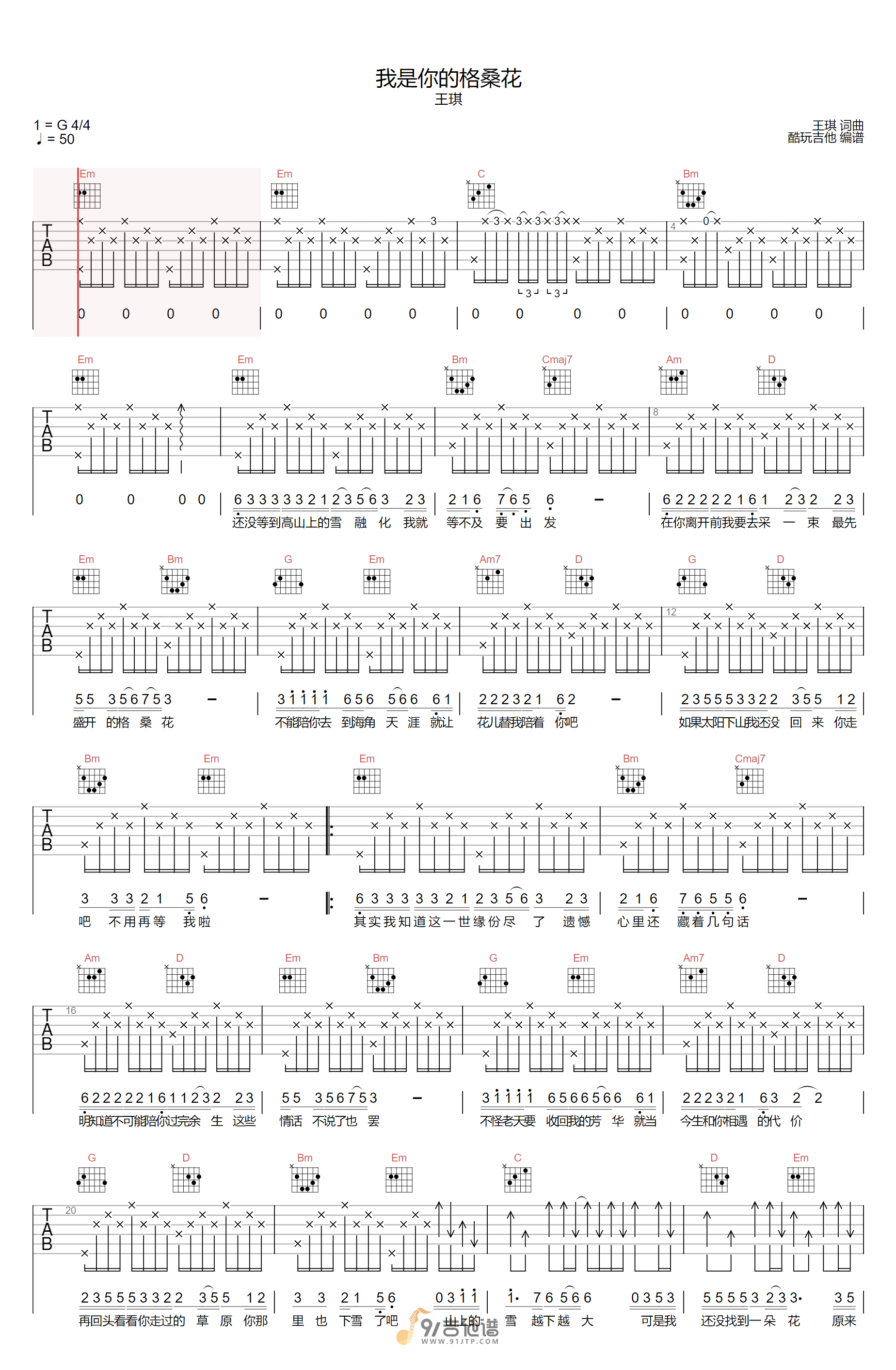 曲谱介绍: 曲谱简介:我是你的格桑花吉他谱,王琪演唱的一首歌曲,4/4拍的节奏,这首歌曲的原调为G调,这里曲谱采用了G调指法进行编配,演唱时可不夹变调夹,曲谱由酷玩吉他编配出品。和以前一样,王琪依旧采用一贯的悲伤爱情为基调,但这次是将生离死别和难舍难分的爱情交织在一起,着实又写出了一个让人揪心的爱情故事。