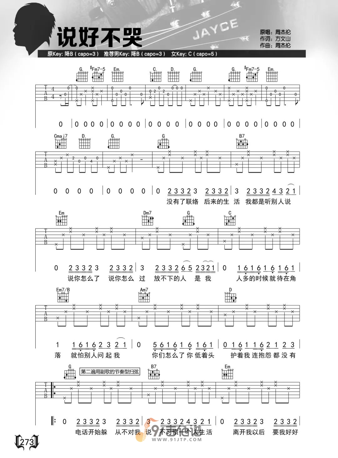 曲谱介绍: 曲谱简介:说好不哭吉他谱,周杰伦演唱的一首歌曲,4/4拍的节奏,这首歌曲的原调为降B调,这里曲谱采用了G调指法进行编配,演唱时夹变调夹3品可回到原调,也可根据个人实际嗓音情况选择。曲谱由蓝莓吉他编配出品。是一首关于成全与约定的情歌,以钢琴缓缓诉说这段凄美绝伦的爱情故事,整首歌以钢琴为主故事线、弦乐编织出抒情场景,营造出一种爱定格在分手时的那句“说好不哭”。