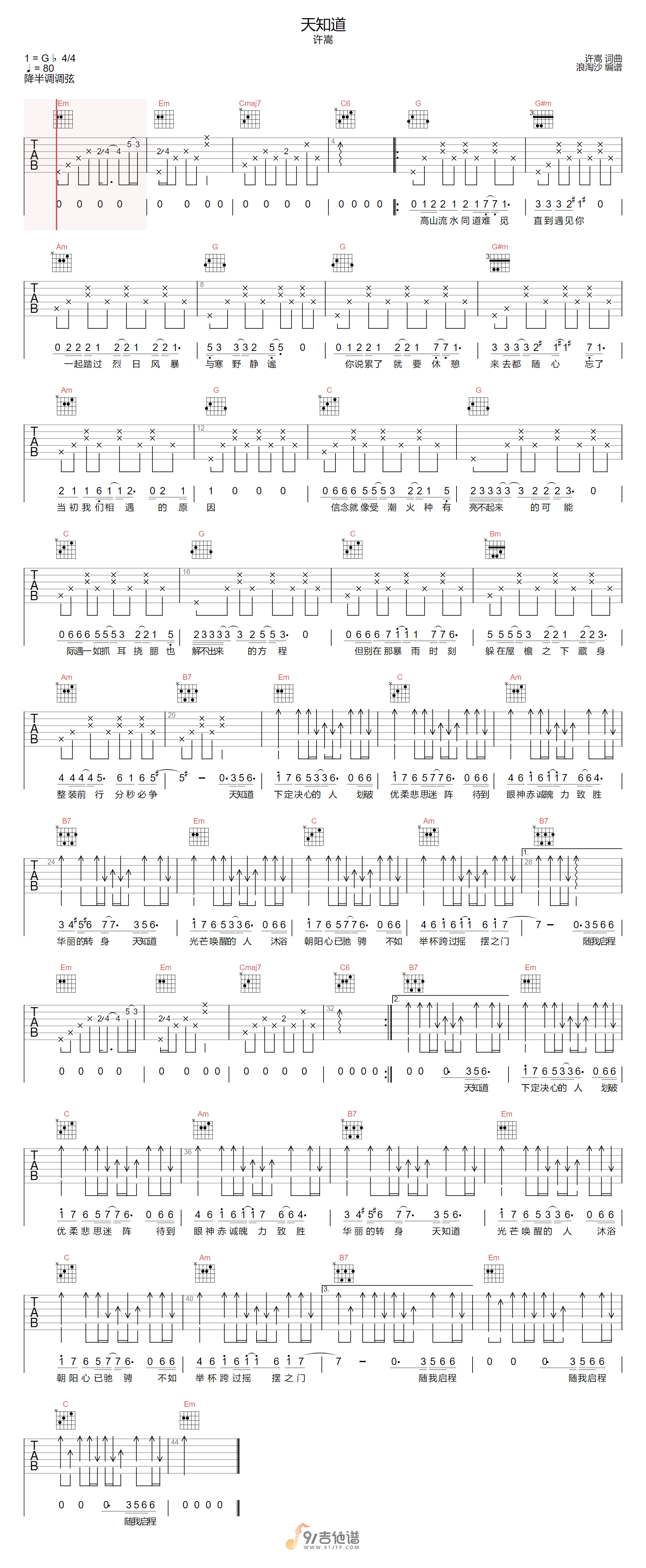 曲谱介绍: 曲谱简介:天知道吉他谱,许嵩演唱的一首歌曲,4/4拍的节奏,这首歌曲的原调为#F调,这里曲谱采用了G调指法进行编配,演唱时降半音调弦可回到原调,也可根据个人实际嗓音情况选择不降音或夹几品。曲谱由浪淘沙编配出品。歌曲在悠远的古琴声里揭开序幕,从回味往日美好时光,到思索人生际遇,进而抛开杂念、专注脚下的前行,热气腾腾的鼓点与吉他燃起激情。