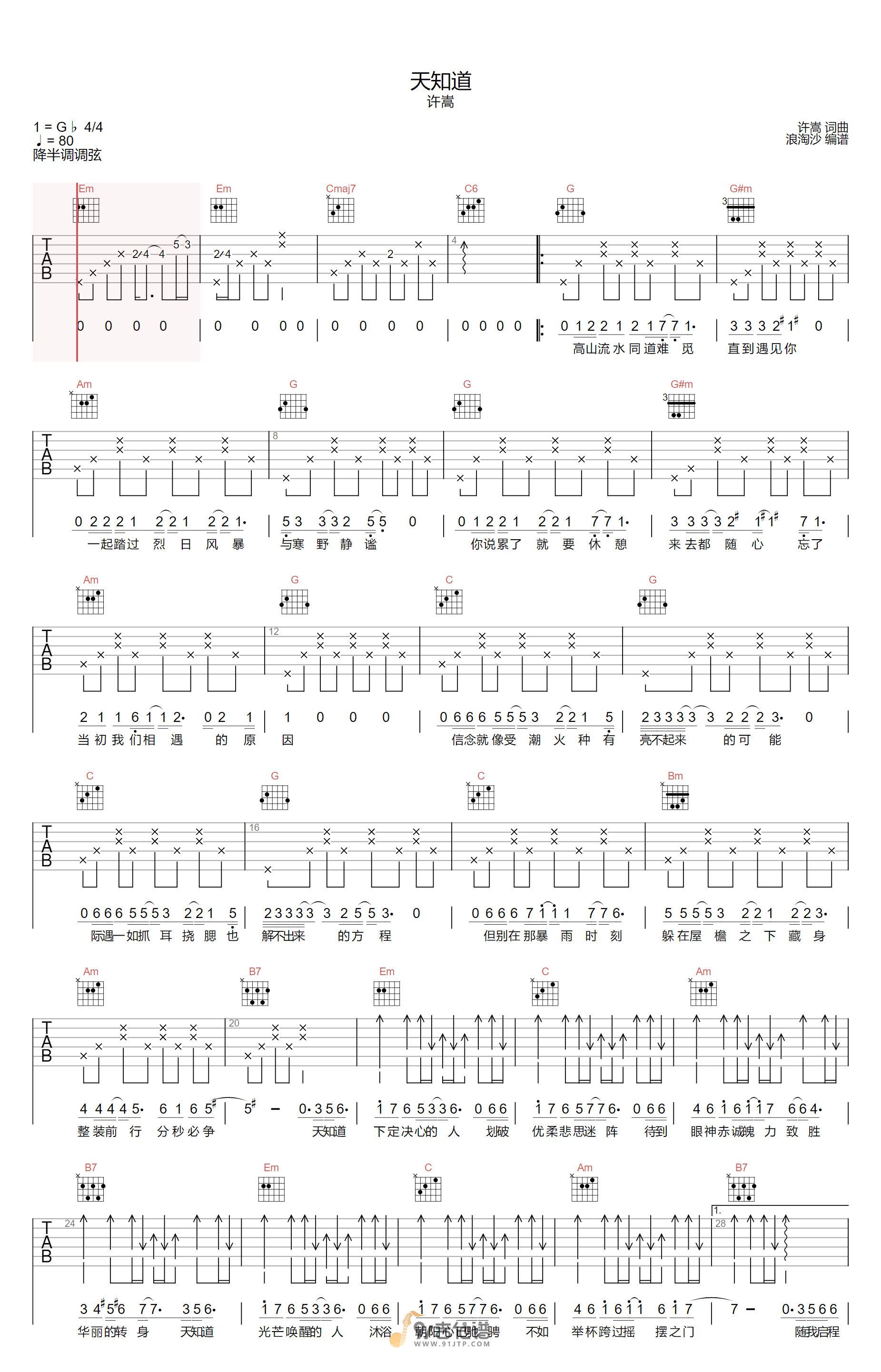 天知道吉他谱 - 许嵩 - G调吉他弹唱谱 - 原版