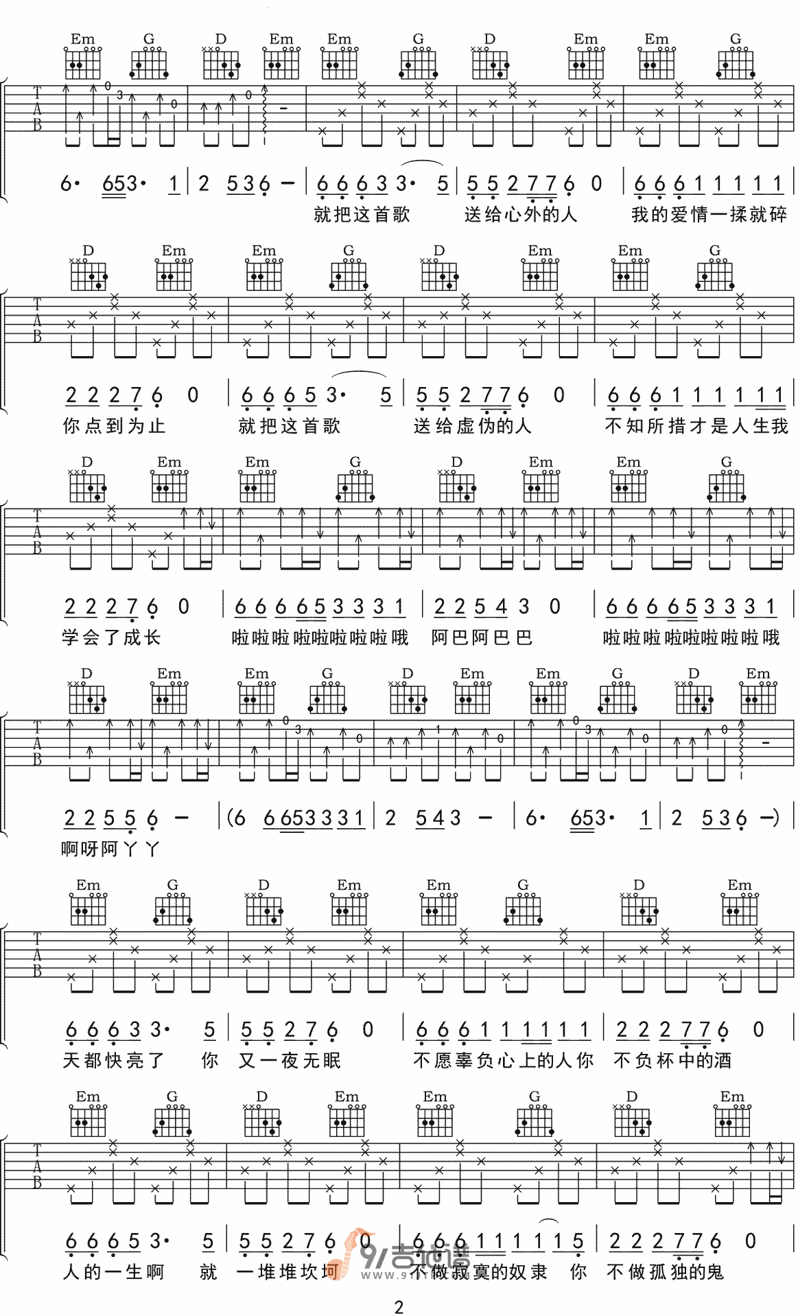 曲谱介绍: 曲谱简介:点歌的人吉他谱,海来阿木演唱的一首歌曲,4/4拍的节奏,这首歌曲的原调为降B调,这里曲谱采用了G调指法进行编配,演唱时夹变调夹3品可回到原调,也可根据个人实际嗓音情况选择。曲谱由琴谱网更新上传,共3张高清图片弹唱吉他谱例,曲谱来源于网络转载,编配制谱者暂不详。就把这首歌,送给失意的你,是喜是悲,尘缘注定,不折磨自己。就把这首歌,送给迷茫的你,屋外沧桑,屋内过往,告别昨夜的愁。